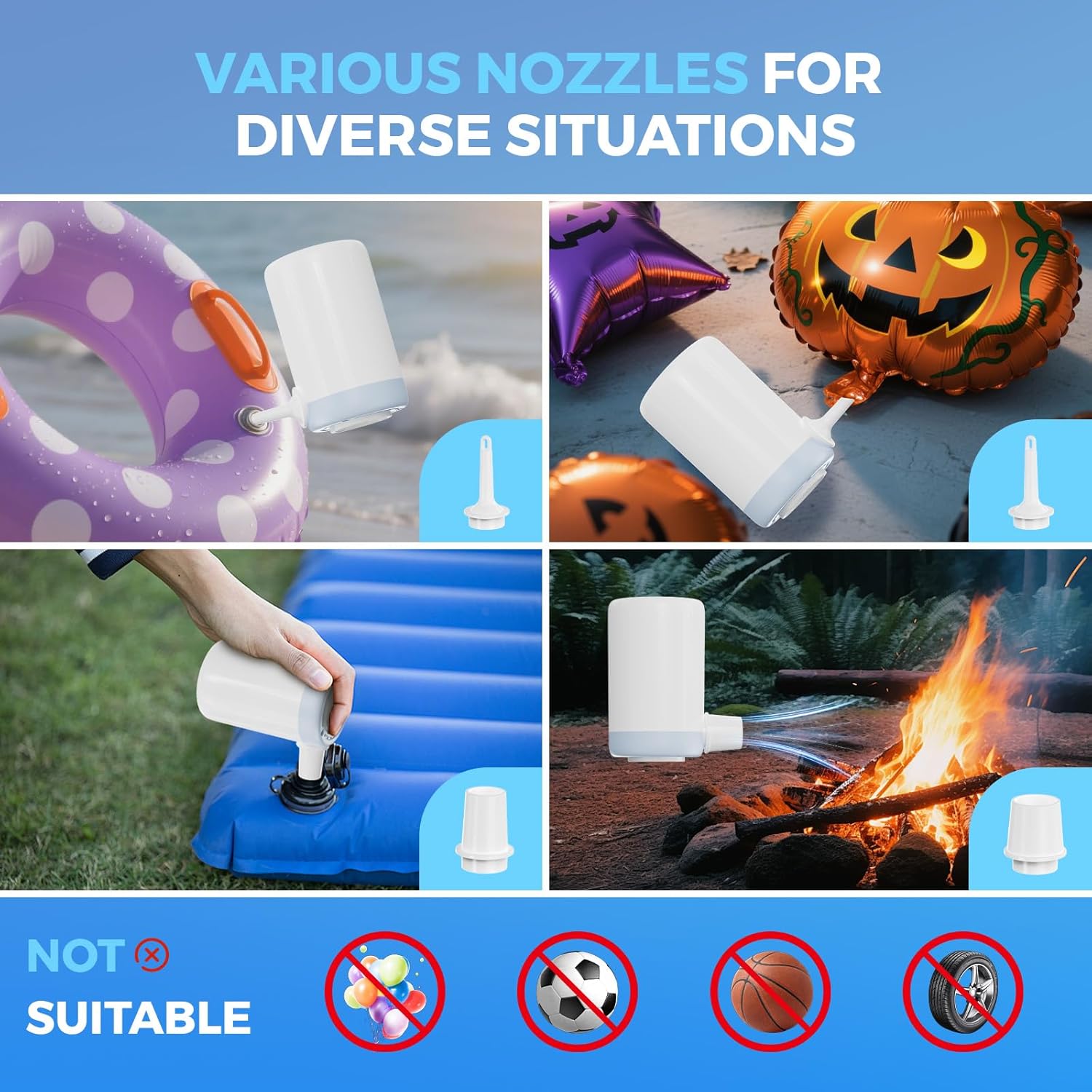 Ultra-Light & Inflation-Deflation 2-In-1: Just 5.2 ounces—this electric pump is lighter than a typical smartphone. It handles both inflating and deflating, comes with 5 nozzles, and is ideal for air beds, inflatable boats, pool floats, and holiday decor (not suitable for stretchy balloons). Double the convenience, with multiple uses