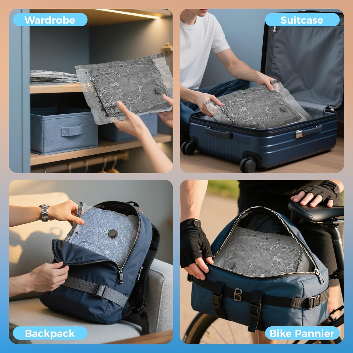 15-Piece Vacuum Seal Bag Kit: Includes 15 storage bags in 3 sizes—5 of 19.7×15.8 inches (for 20-inch carry-ons), 5 of 23.6×15.8 inches (for 24-inch luggage), and 5 of 23.6×19.7 inches (for 28-inch suitcases). It can reduce volume by up to 80%, making it a perfect space-saver for airplane trips, cruises, moving, camping, RV and more