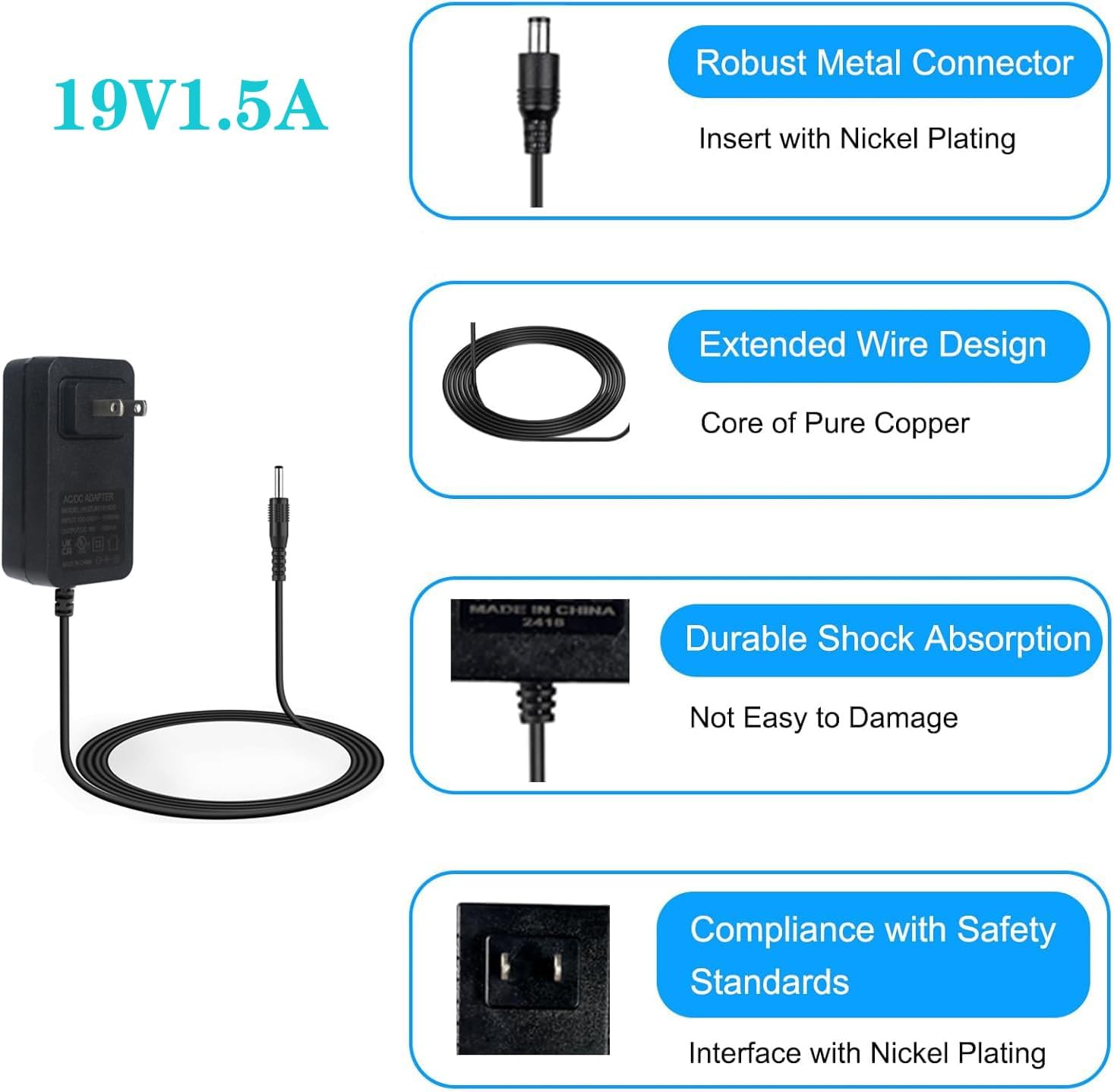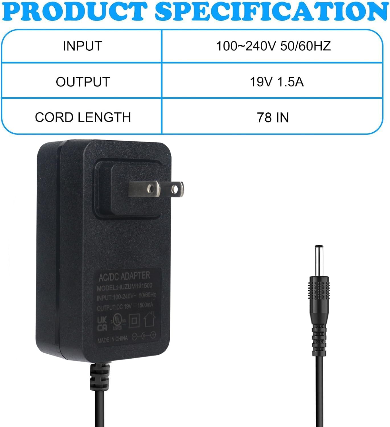 【Parmeter】: AC input 100V-240V 50/60Hz, output 18V-19V works with devices that draws less than 1.5A. The adapter can automatically identify the current amperage required by the electronic device. For example: 50 MA 100 MA 150 MA 200 MA — 800 MA 900 MA 2000 MA, etc.