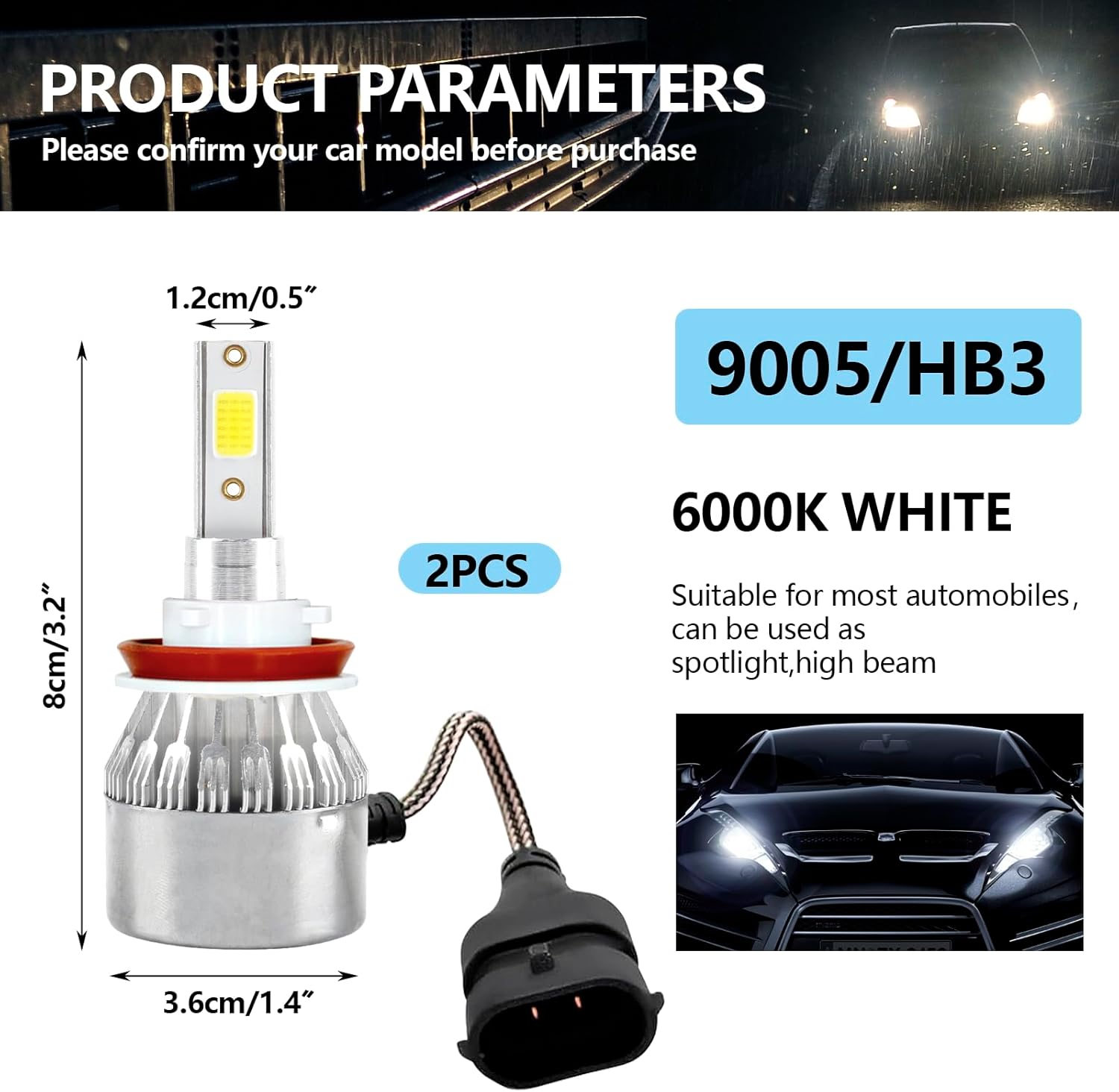 【Packing List】: You will receive 2pcs 9005 headlight bulbs, super bright bulb replacement type 9005/HB3 type, size is 3.23×1.37×1.37 inches. Our headlights led bulbs have a built-in high-speed silent fan to provide you with more efficient cooling performance. Ultrathin lamp base to avoid lack of space for headlight assembly. Please check your car accessories before purchase to make sure it is applicable.
