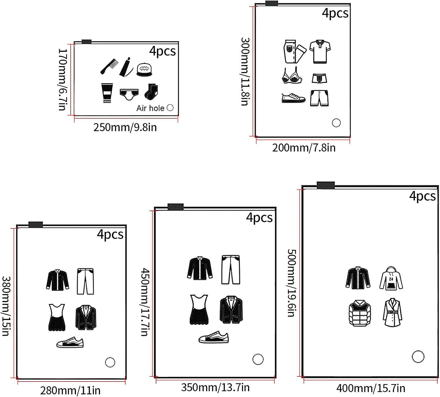Package Includes:You will receive a total of 20 pcs travel storage bags with zips, 5 sizes in: 20*30 cm/7.8*11.8 inch; 25*17 cm/9.8*6.7 inch; 28*38 cm/11*15 inch; 35*45 cm/13.8*17.7 inch; 40*50 cm/15.7*19.7 inch, 4 pcs for each size, enough for your daily use.