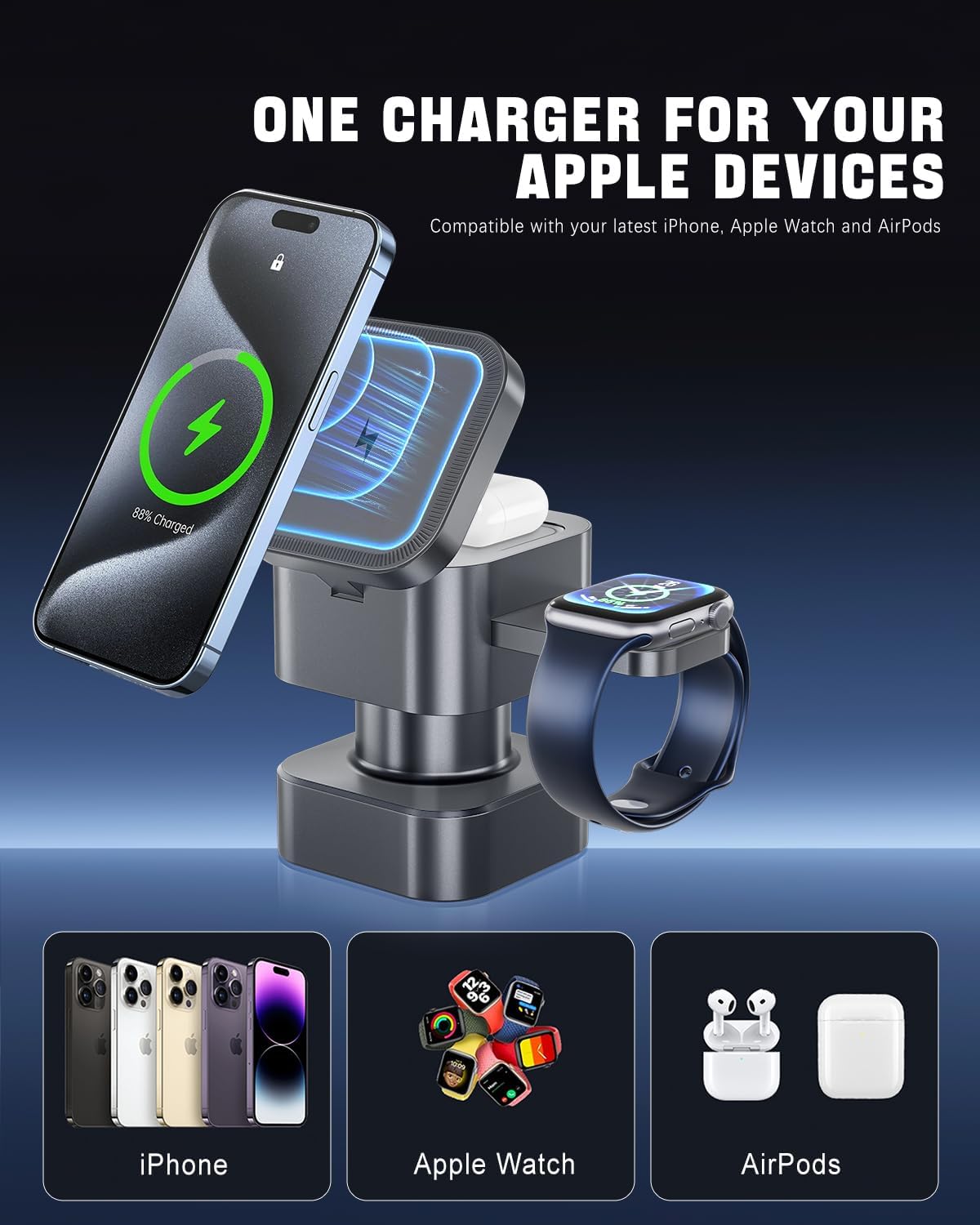 2026 Edition 4-in-1 MagSafe Charging Dock with Night Light & Fast Charging:This upgraded 4-in-1 wireless charging dock seamlessly integrates a sleep-enhancing night light, delivering fast magnetic charging for your entire Apple ecosystem. Designed for iPhone 17/16/15/14/13/12 series (MagSafe-compatible), Apple Watch Ultra/Series 10/9/8/7/6/5/4/3/2/SE, and AirPods Pro 4/3/2/1. The night light provides soft illumination for your bedside or desk—simply tap to turn it on or off.