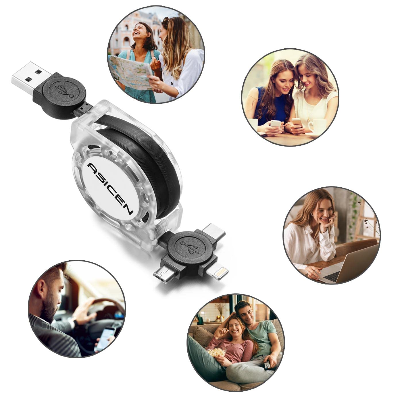● Retractable Multi USB Data Transfer Cable, ASICEN 3 in 1 USB A to Lightning/Micro USB/USB C connector support fast charging and syncing, the charging speed reaches480Mbps.