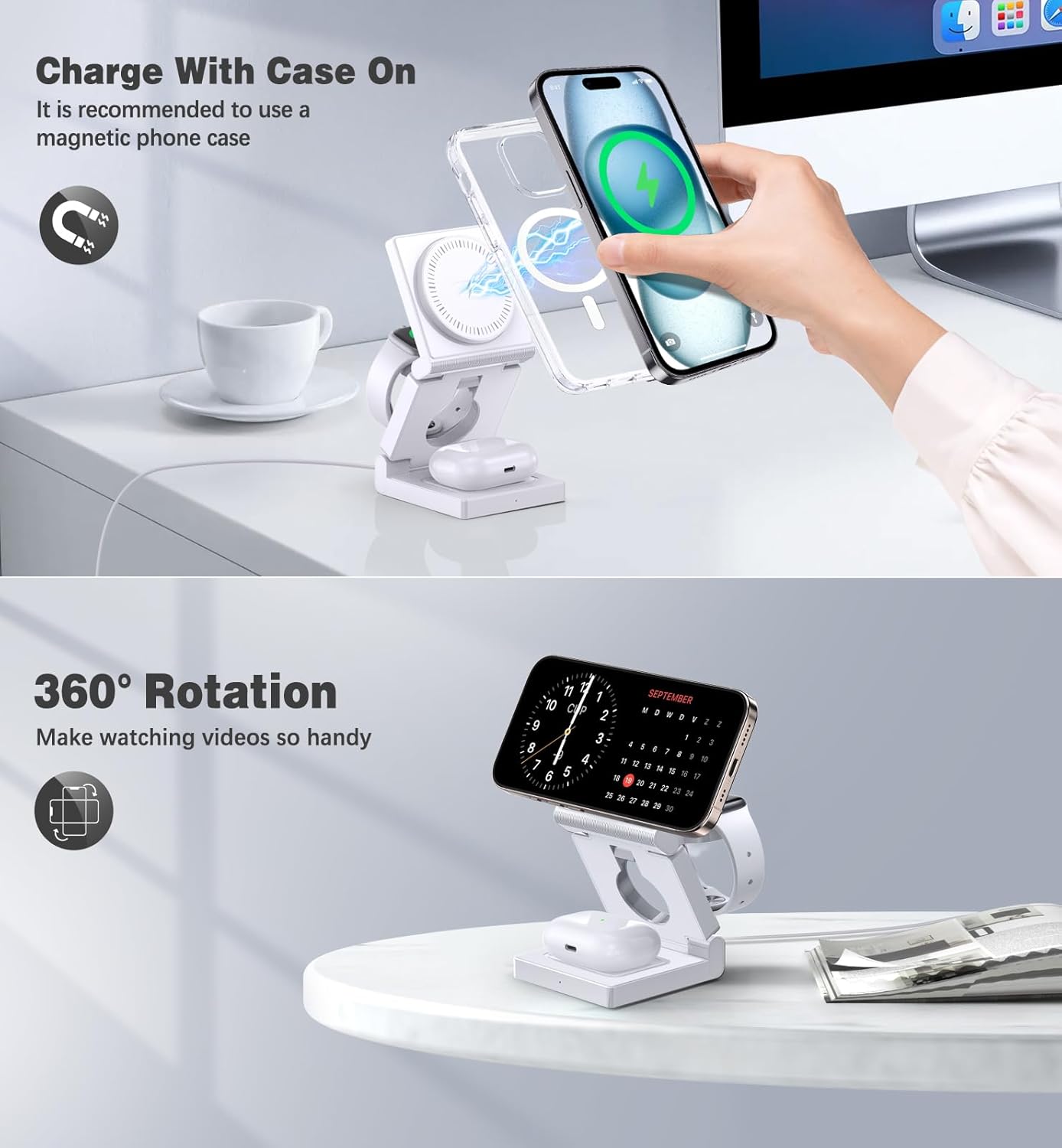 【Upgrade 3 in 1 Wireless Charging Station】The magnetic wireless charger is compatible with iPhone 17/17 Pro/17 Plus/17 Pro Max17/16 Pro/16 Plus/16 Pro Max/15/14/13/12 series, the watch area is only for iWatch 3/4/5/6/SE/7/8/9/Ultra 1/Ultra 2, and earphone area is only suitable for AirPods 2/3/Pro 1/Pro 2. Our 3 in 1 Wireless Charging Stand provides 15W fast charging with secure magnetic alignment. Note: Support Mag-Safe case to charge your device, it is very stable.