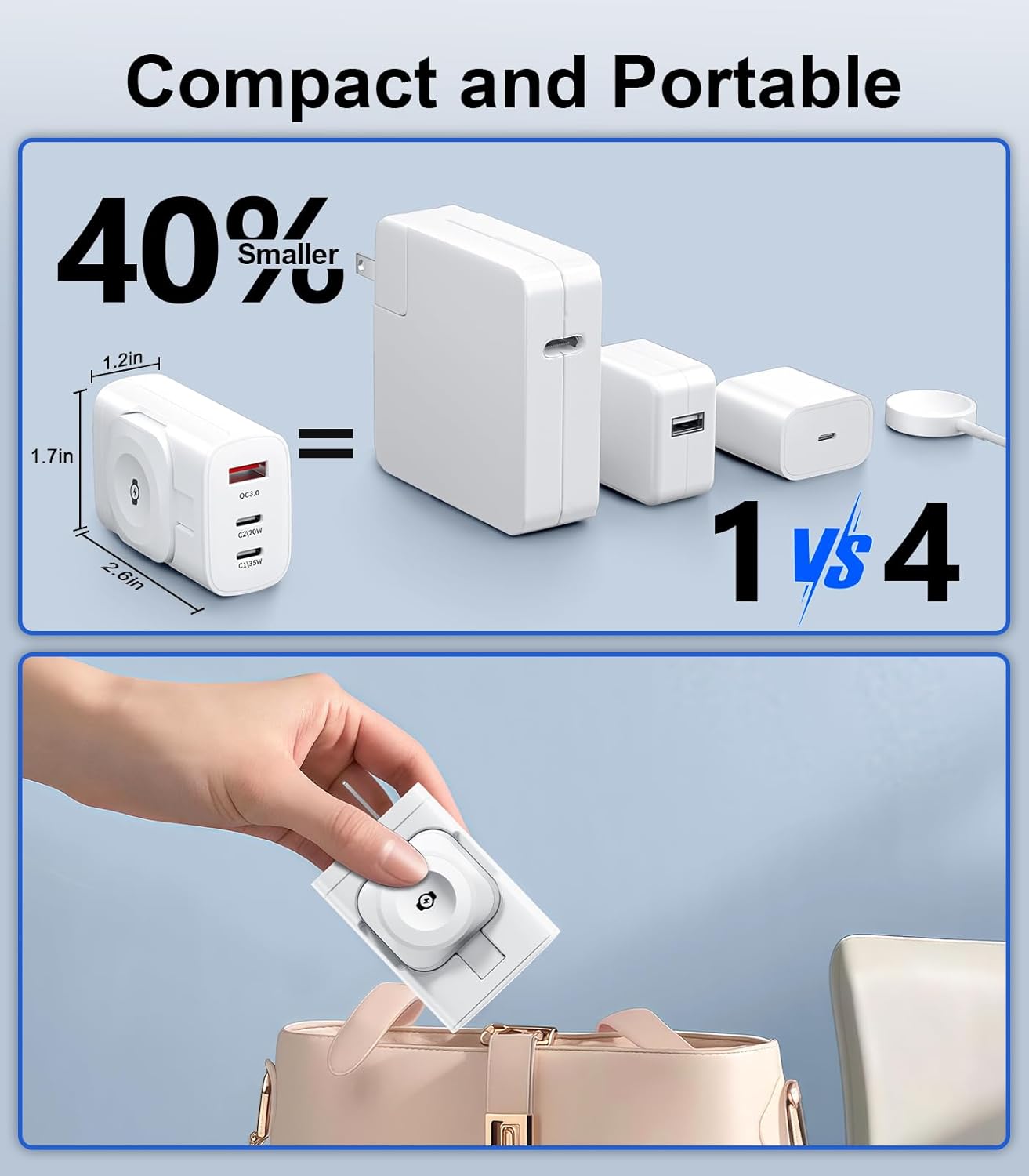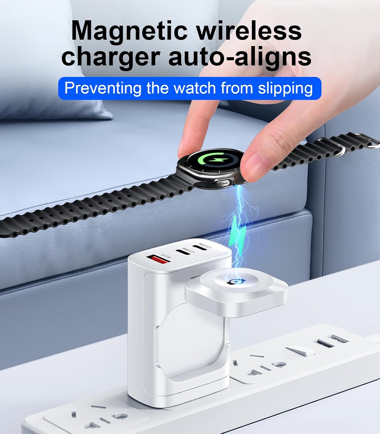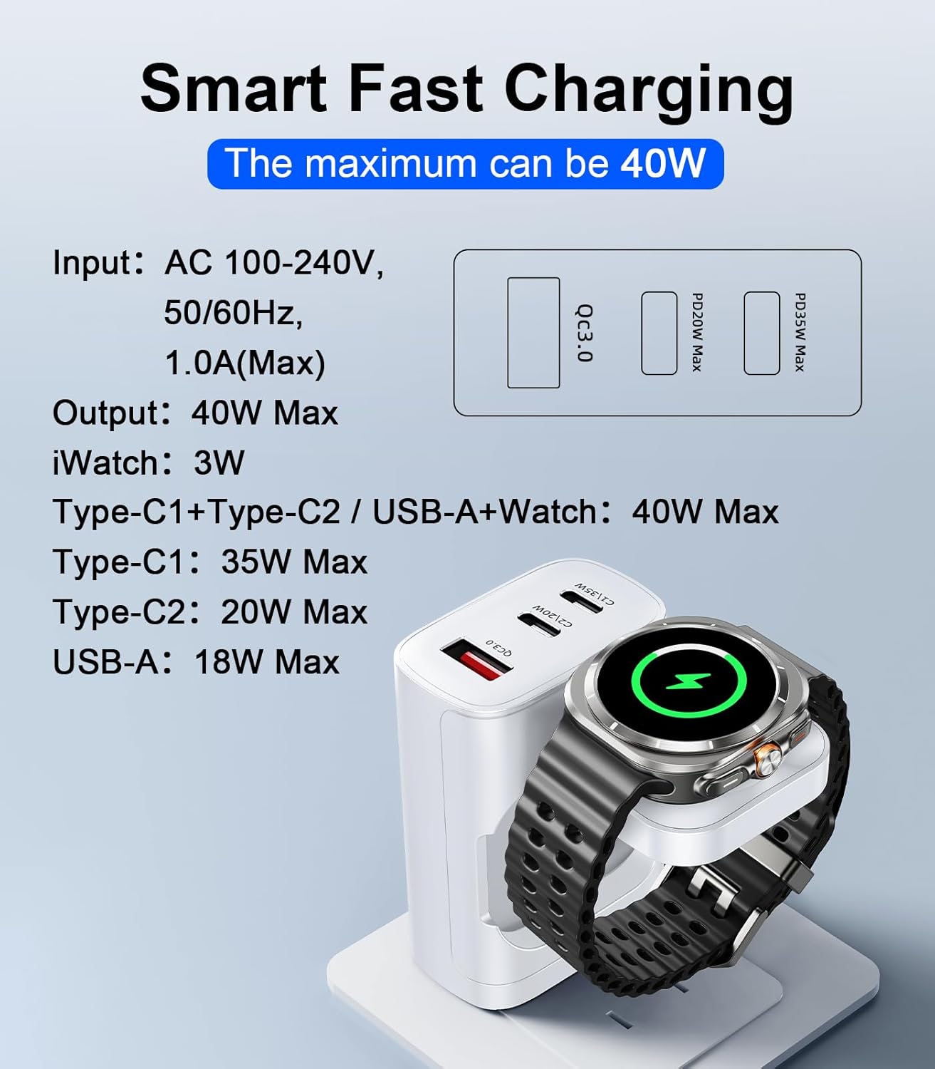 40W FAST CHARGING: For Galaxy Watch portable travel charging station is equipped with 【35W USB C port】【20W USB C port 】【18W USB A port】【3W Samsung Watch magnetic wireless charger】Charge your phone to 70% and your Galaxy Watch to 100% in less than 30 minutes, saving you hours of charging time.Warm tips: this product doesn’t include cables.