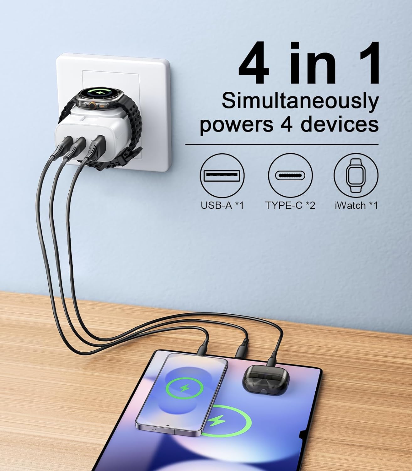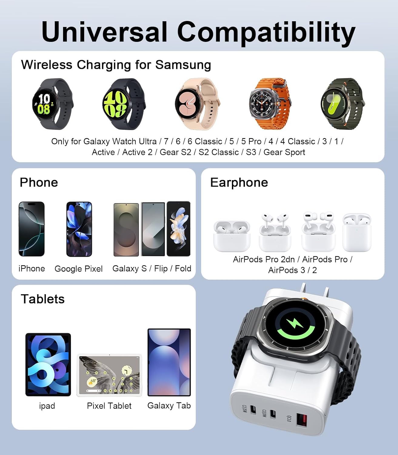 4-in-1 MULTI-PORT CHARGER: For Samsung watch charger fast charging block includes two USB-C ports, one USB-A port, and a 90° foldable Galaxy Watch wireless charger. You can easily charge up to four devices at once, saving space on your power strip, keeping your desk tidy, and perfect for on-the-go and traveling!