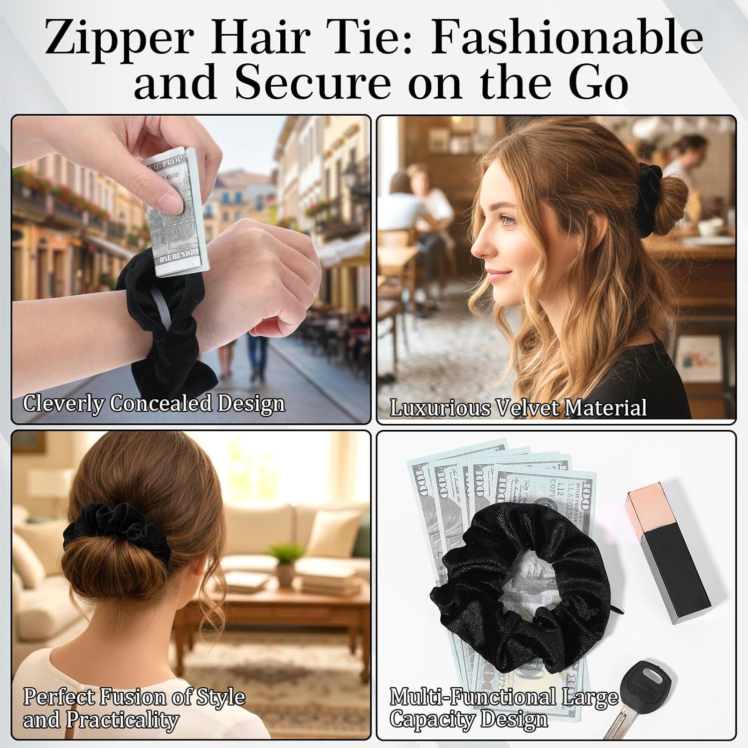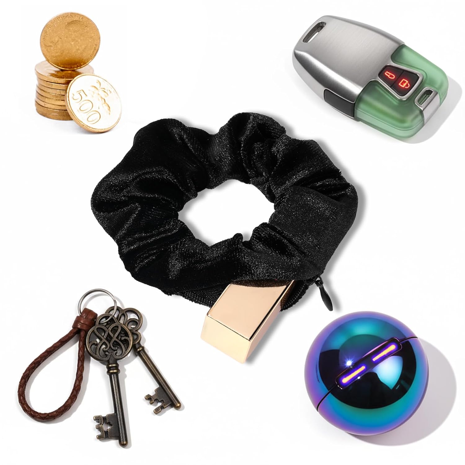 【Comfortable Lightweight Design】Crafted from soft velvet fabric with stretchy elastic, these pocket scrunchies feel weightless during wear. The smooth zipper design prevents hair snagging while comfortably holding items like coins, or emergency medication.