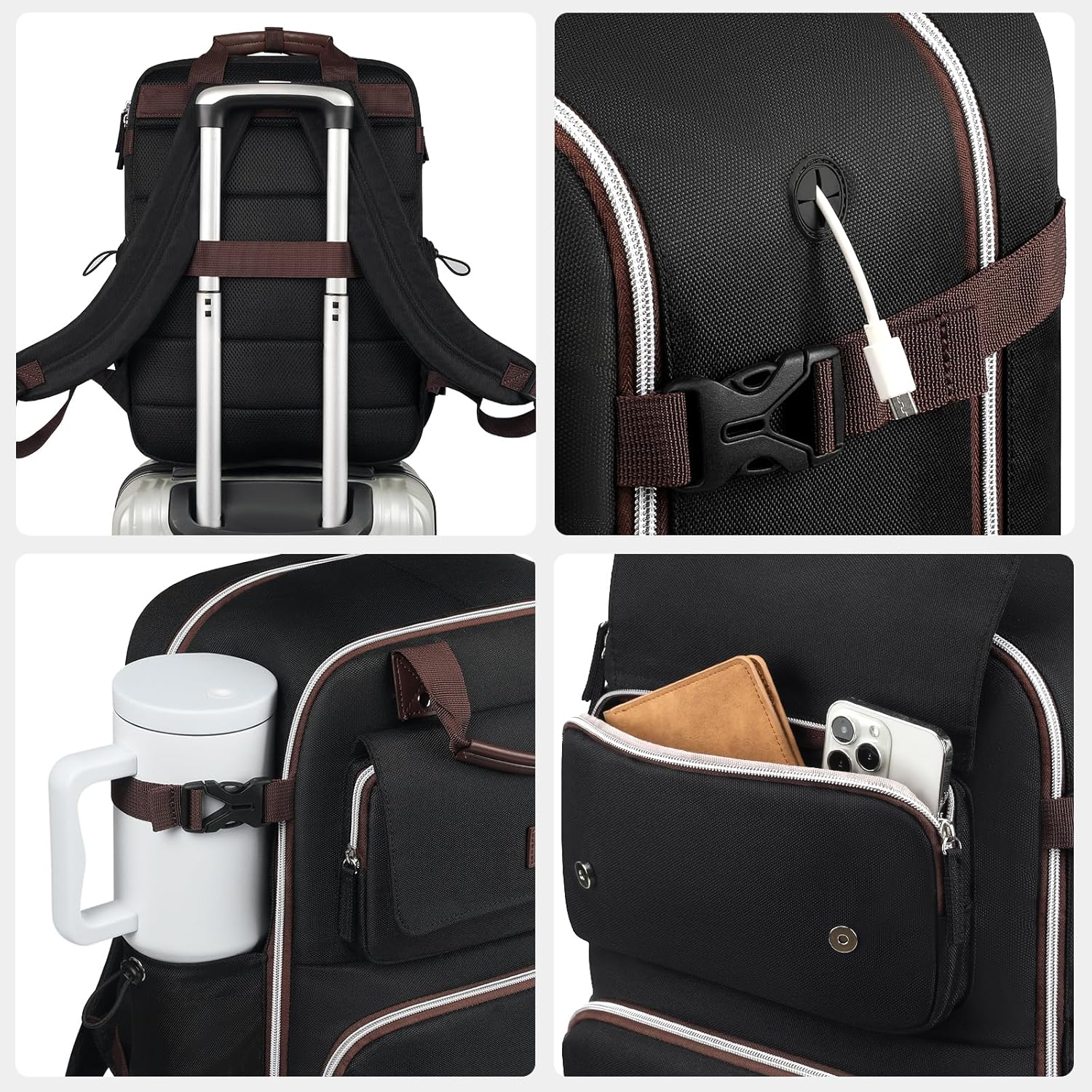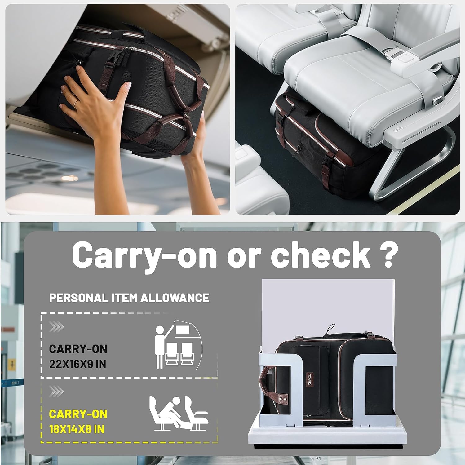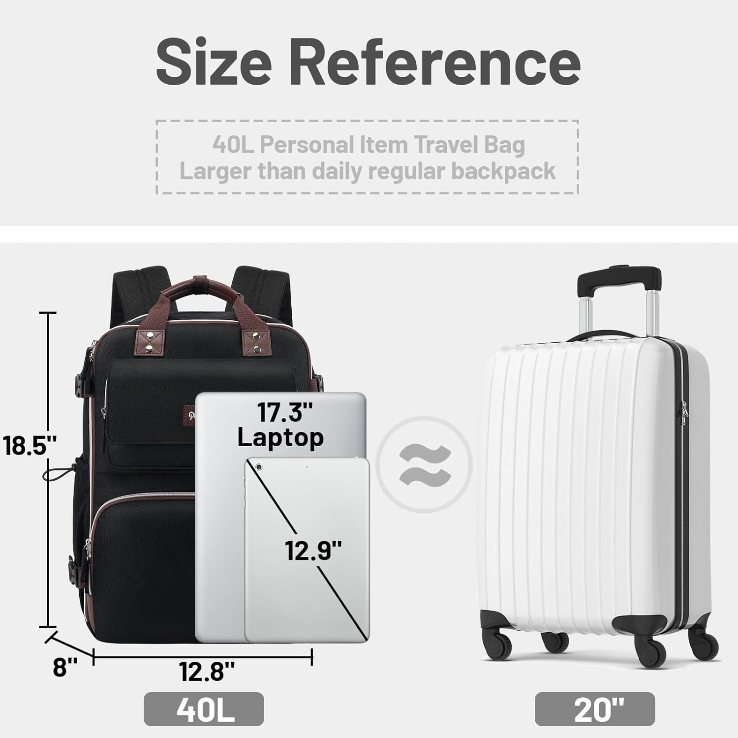 Large Capacity & Organized:With a 40L capacity, perfect for 3-5 days of travel essentials. Personal item travel bag features 2 main large compartments and 9 allocated inner and side pockets to separate tech electronics accessories from daily necessities. The laptop compartment can hold up to a 17.3-inch laptop, the suitcase compartment is roomy enough for business travel essentials such as folders, magazines, tablets and clothes. Two side pockets are designed for water bottle and umbrella