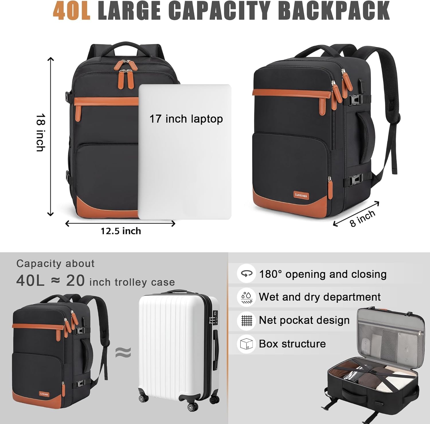 🎒【Spacious 40L Capacity – Organized and Efficient】Designed with multiple functional compartments and a roomy interior, this 40L backpack fits a 17” laptop, clothes, and daily essentials with ease. Keep your items neatly organized whether you’re heading to work, or a weekend getaway