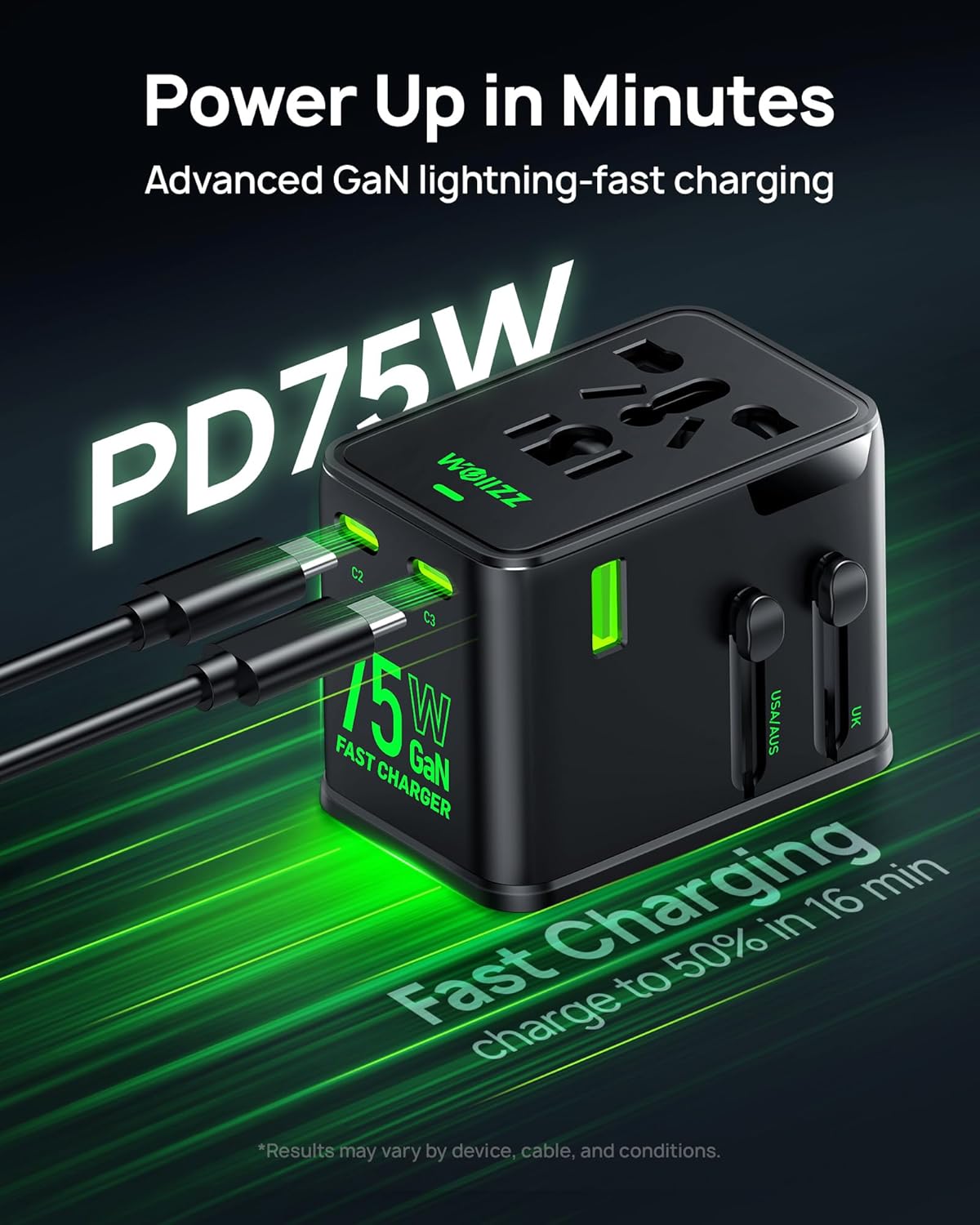 ADVANCED GaN FAST CHARGING: This universal travel adapter runs cooler with GaN, packing 75W total into a compact body. Two USB-C laptop ports hit 70W each for rapid MacBook top-ups, plus USB-C 30W and USB-A 30W for fast phones, tablets, cameras, and earbuds charging. With multiple devices, power is smartly shared (75W total)