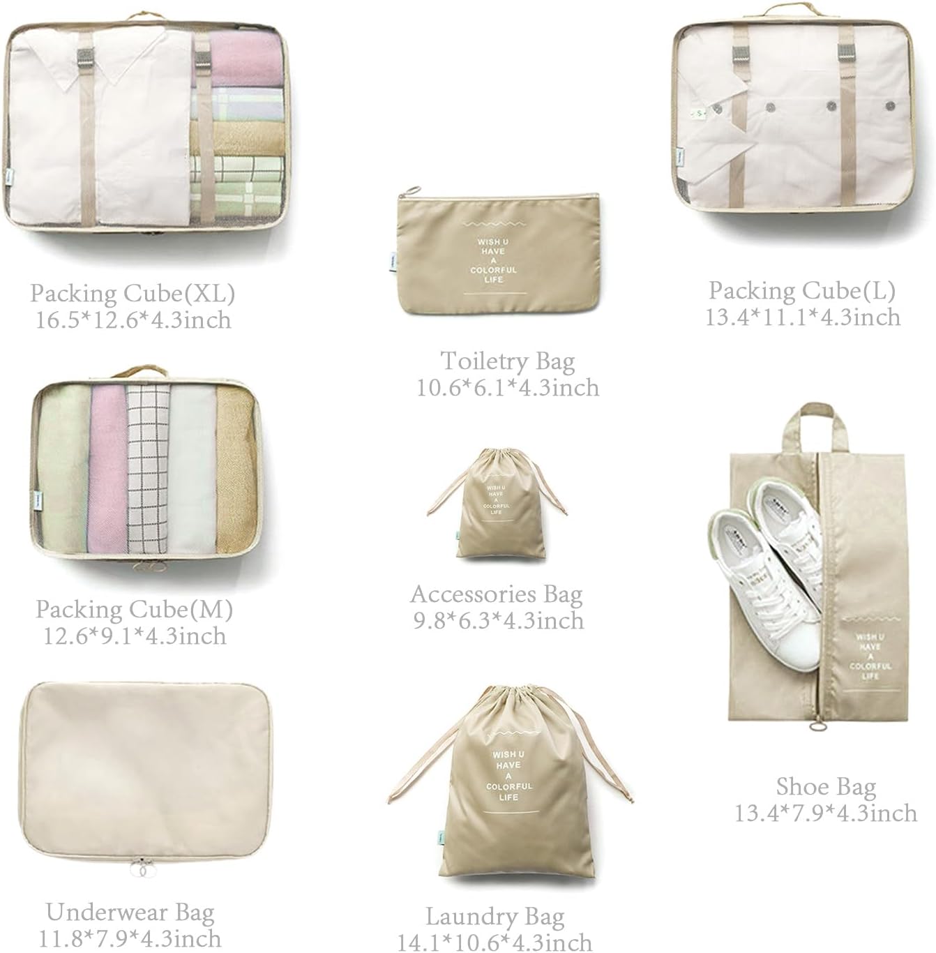 8 Pieces Mesh Packing Cubes for Travel, Luggage Packing Organizers Bags Set, Travel Essentials Suitcases Accessories with Laundry Bag, Storage Shoe Bag, Clothing Underwear Bag (Cream, 8 set)