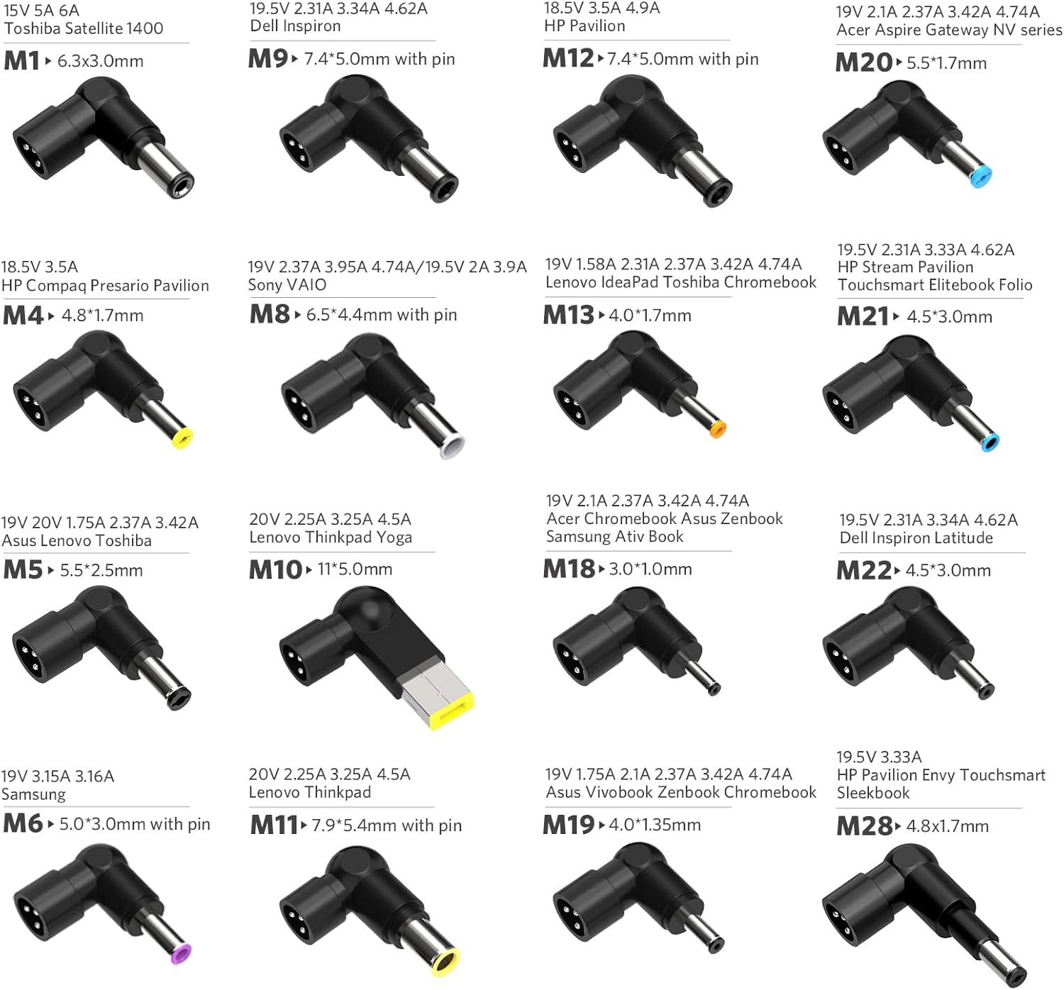 [Worldwide input & output] Input: 100-240V 50-60Hz. Output: 16V 18.5V 19V 19.5V 20V. Support 2.25A 2.31A 2.37A 3.25A 3.33A 3.34A 3.42A 3.5A 4.5A 4.62A 4.74A current. This universal laptop charger is prefectly compatible with 90w 65w 45w laptop chargers and adapters. (★NOT for devices its power over 90W.)