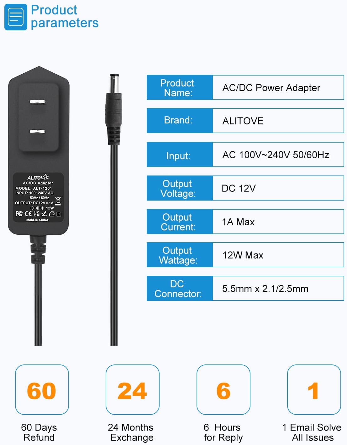 Please Note: 1. Before purchasing, please check whether the working voltage of your device is 12V and the current is not greater than 1A; 2. Check whether the DC connector is the same size as the product (5.5mm*2.1mm, please see the picture for details)