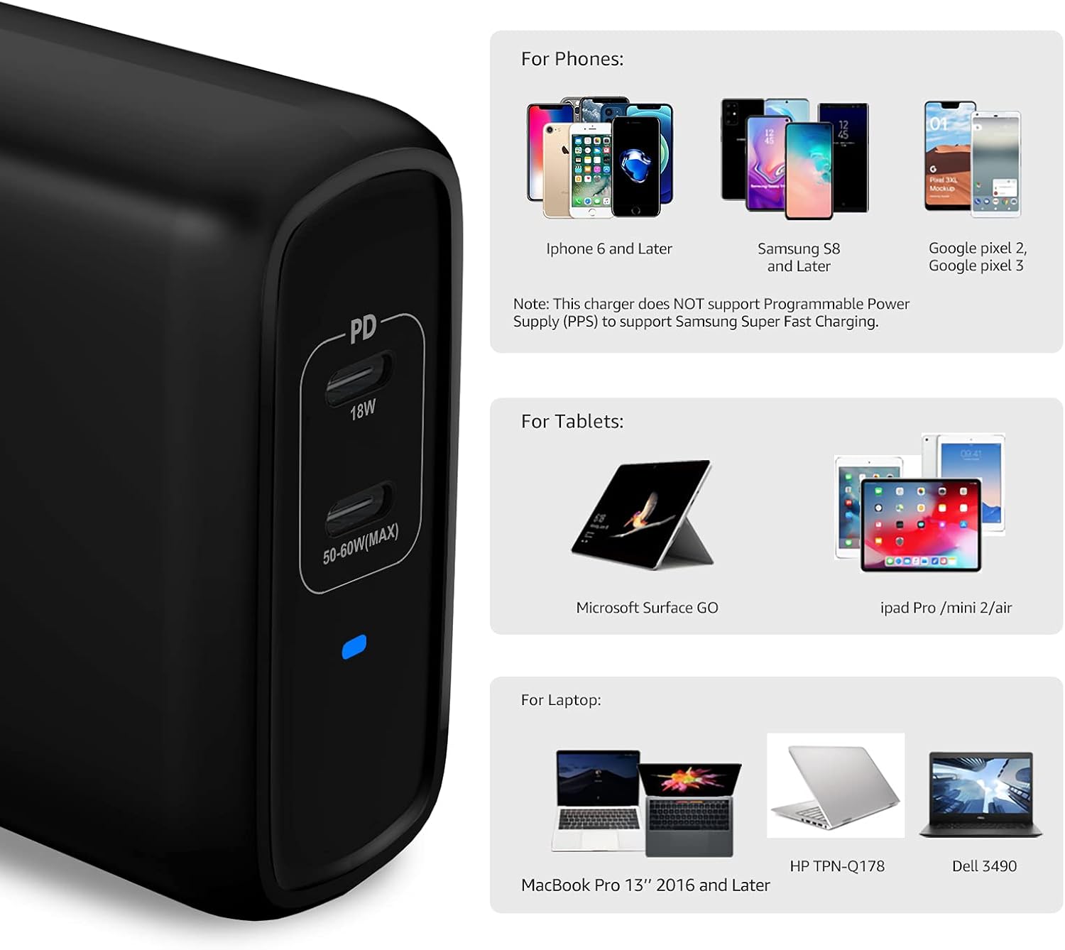 Output one port: PD 3.0 (USB-C1 Port): 5V ⎓ 3A / 9V ⎓ 3A / 15V ⎓ 3A /20V ⎓ 3A (Up to 60W); Output dual ports: (USB-C1 Port): 5V ⎓ 3A / 9V ⎓ 3A / 15V ⎓ 3A /20V ⎓ 2.5A (Up to 50W), PD 3.0 (USB-C2 Port): 5V ⎓ 3A / 9V ⎓ 2A (Up to 18W)