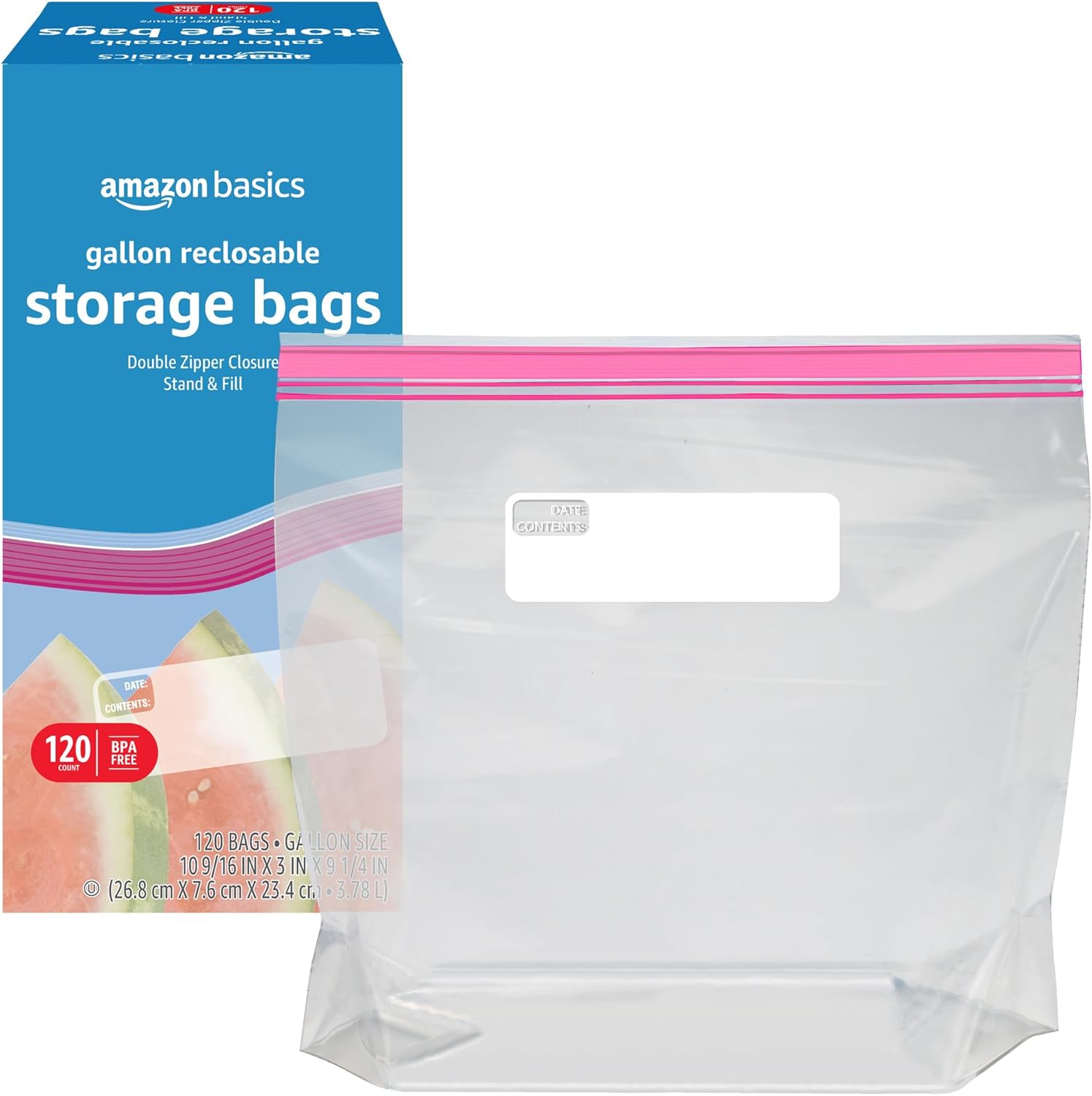 Amazon Basics Gallon Food Storage Bags, 120 Count (Previously Solimo), Reclosable top has a double zipper closure. Stand and Fill base with same gallon capacity