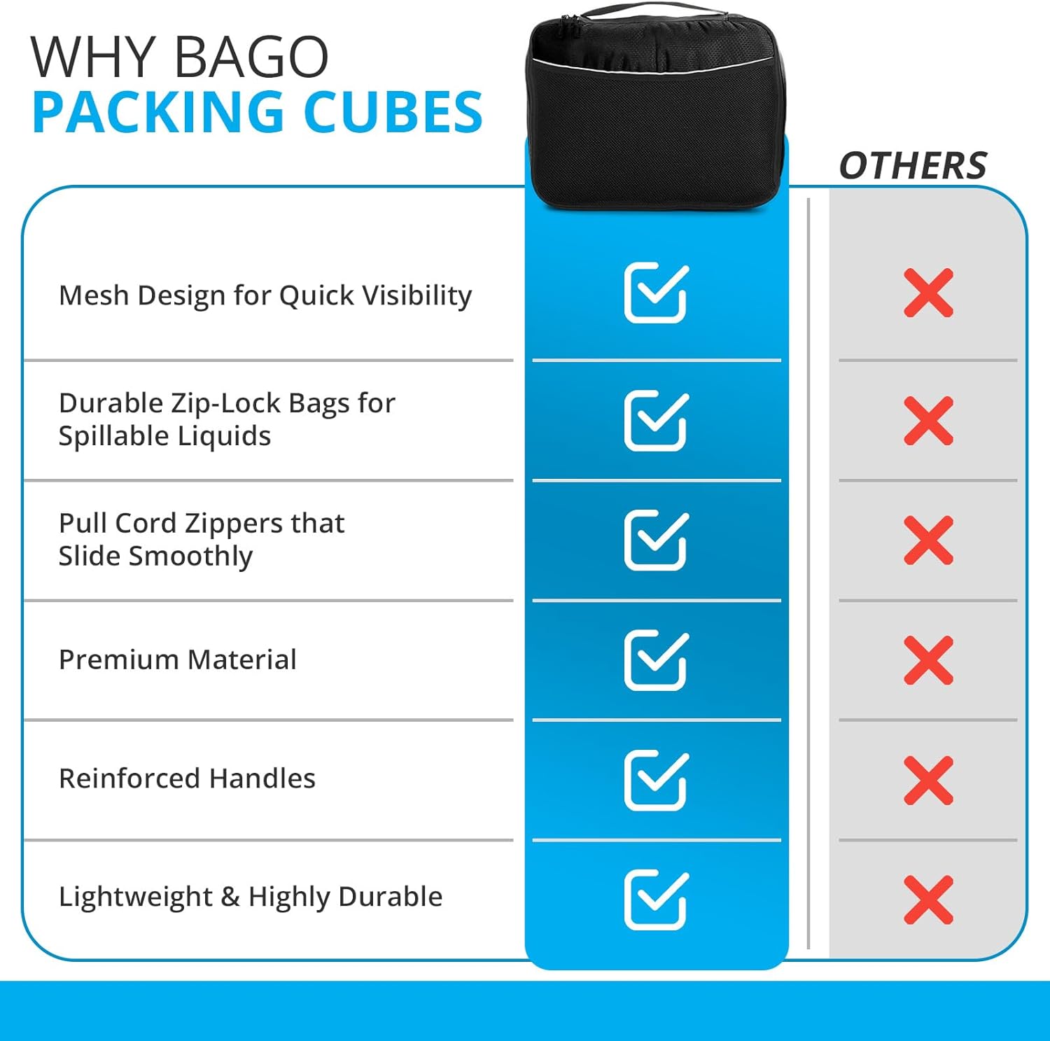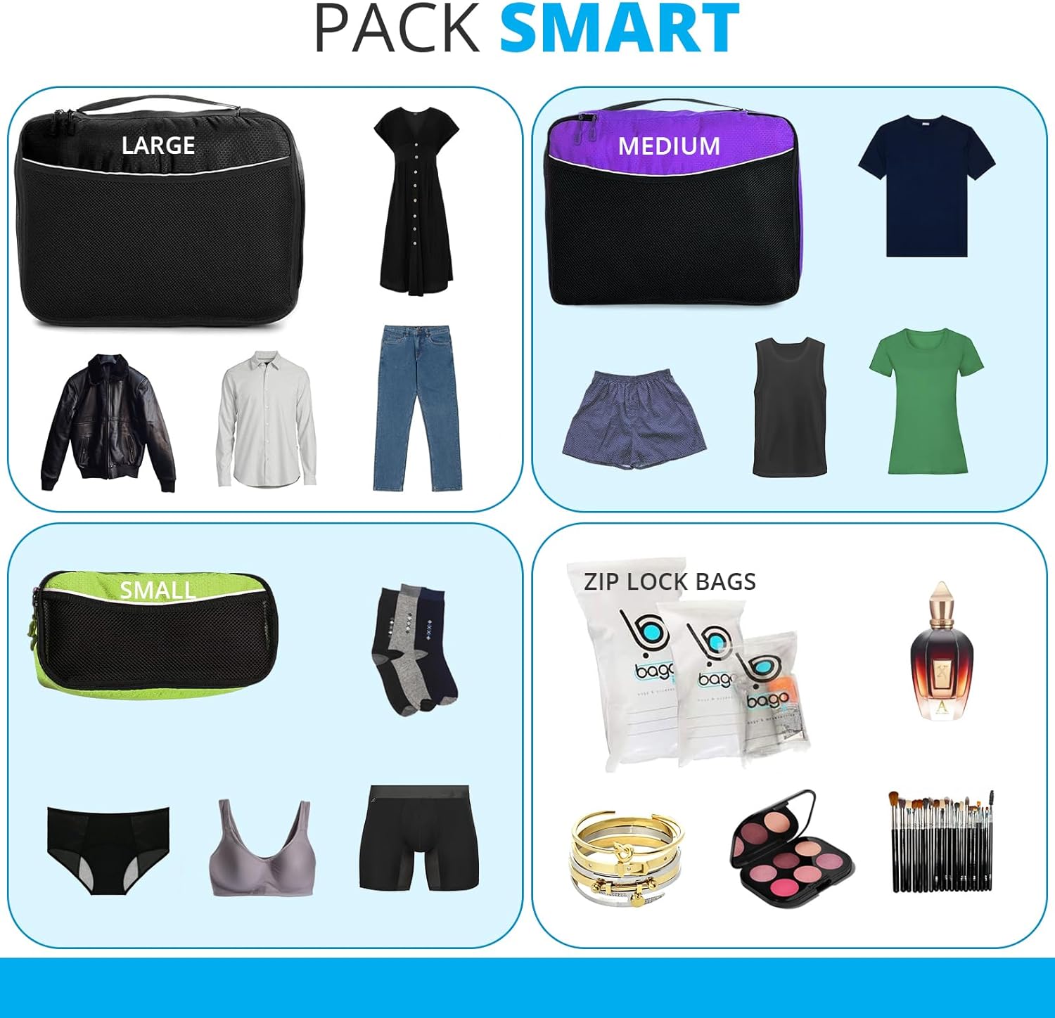 bago 8 Pcs Packing Cubes for Travel – 5 Travel Packing Cubes for Suitcases with 3 ZipLock Bags, Luggage Organizer Bags to Get Maximum Storage, Save Time & Effort to Pack (Black Blue Purple Green Pink)