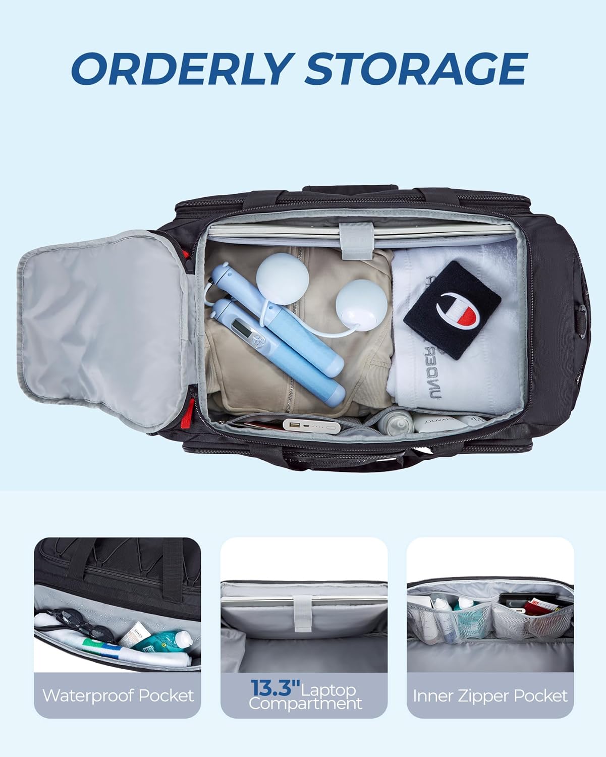 Spacious & Multi-Compartments: The BAGSMART sports bag is designed to meet all your storage needs. With multiple compartments including a waterproof pocket, a 13.3″ laptop compartment, and an inner zipper pocket, this gym bag keeps your belongings neatly arranged and easily accessible. Carry everything you need in one convenient and organized space. Dimensions:20.8×10.2×9.8 inches
