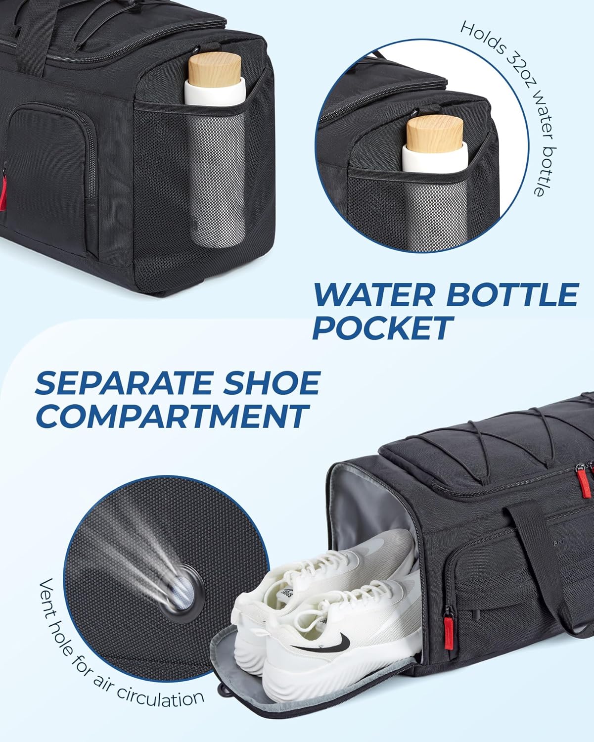 Versatile Functionality: Our sports bag is equipped with functional pockets on both sides, including an independent shoe compartment and a water bottle pocket. The breathable design of the shoe compartment ensures proper air circulation, keeping your shoes fresh. The water bottle pocket securely holds a 32oz bottle, ensuring you stay hydrated during workouts or travels