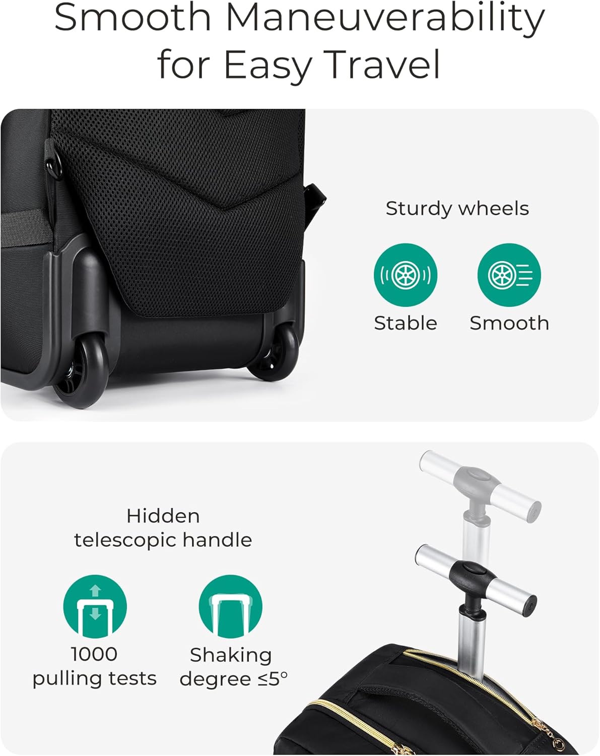 Versatile 3-in-1 Travel Backpack with Wheels: Travel backpack can be carried, rolled, or handled from the side, featuring hidden shoulder straps and sturdy hooks for flexibility. The durable telescoping handle ensures smooth maneuverability, while robust wheels glide easily over different surfaces for a stable experience. Plus, a protective wheel cover keeps your clothes clean
