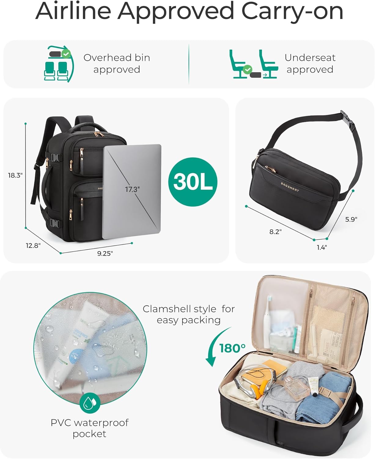 Multi-Pocket Organization: Stay organized with womens backpack, featuring a variety of compartments, including a padded laptop section that fits devices up to 17.3 inches. The internal wet/dry pocket keeps wet items separate, while the anti-theft pocket on the back adds an extra layer of security for your valuables.Front and side pockets provide quick access to travel essentials. Carry-on travel backpack dimensions: 18.3″ x 12.8″ x 9.25″; Weight: 2.2 lb, Capacity:30L