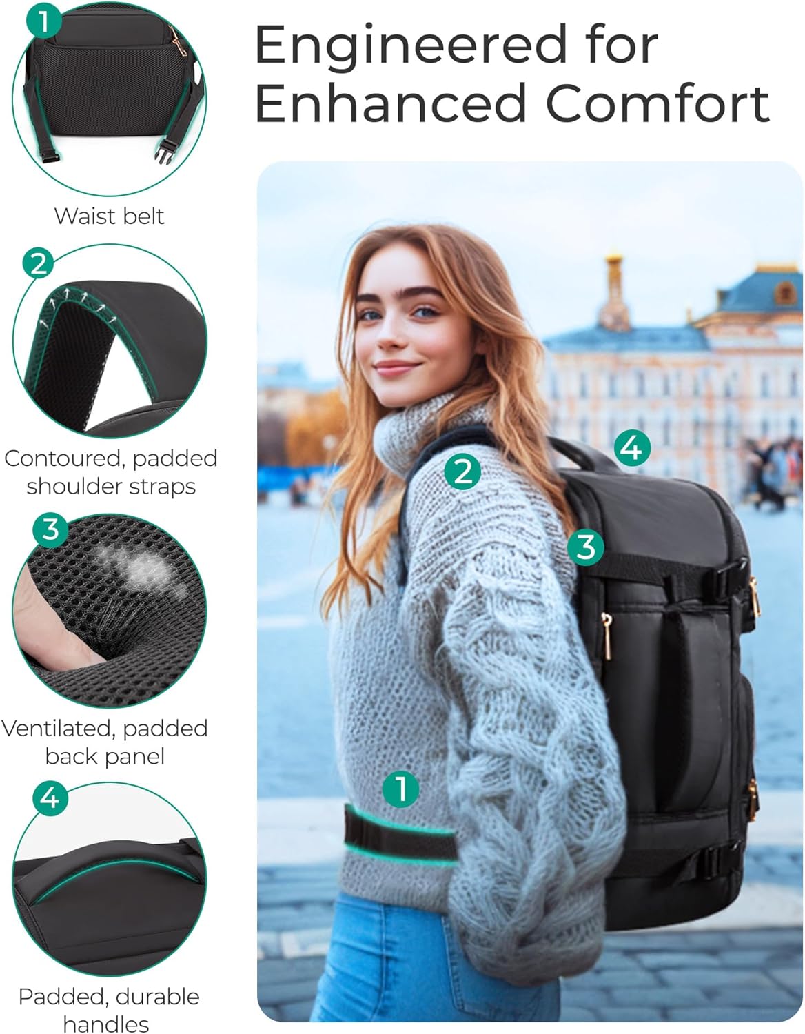 Comfort Meets Functionality: Crafted with user comfort in mind, carry on travel backpack is equipped with a breathable mesh back panel and thick shoulder straps tominimize strain during extended wear. The adjustable waist belt helps distribute weight for a customized fit, ensuring comfort whether you’re commuting, traveling, or hiking