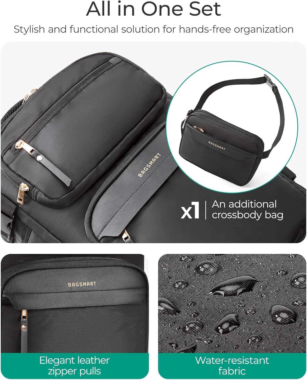 Versatile Waist Bag: Enhance your travel experience with the included crossbody bag, a stylish and practical addition to our personal item travel bag for effortless on-the-go convenience. The waist bag can be worn independently for a hands-free experience. When not in use, the bag fits neatly into the backpack’s back pocket, with the belt threaded through both sides for effortless storage. Secure the waist belt to lighten your load and enhance comfort. Waist Bag measures 8.2″ x 5.9″ x 1.4″