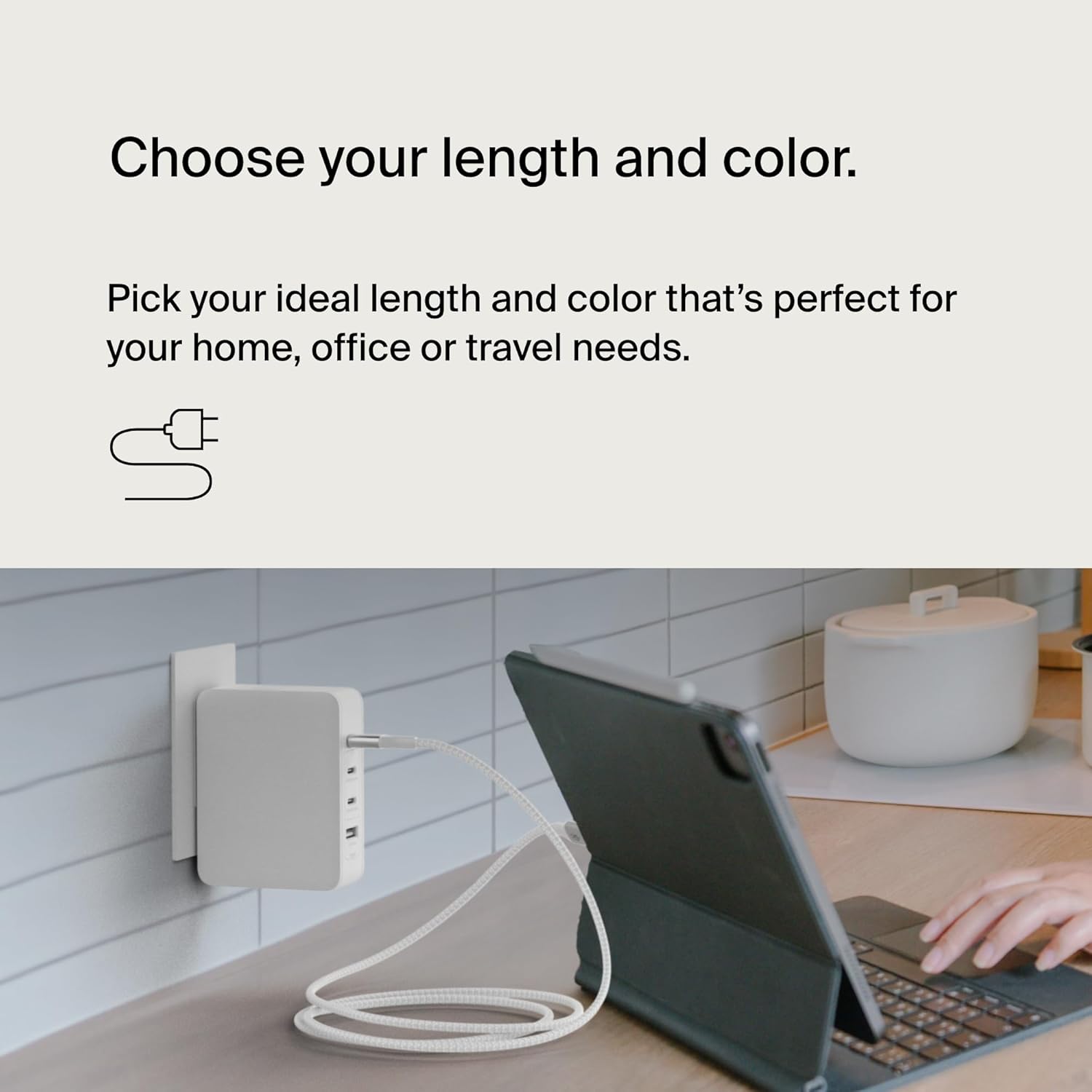 Connect your USB-C device to safe, fast power with our durable BoostCharge USB-C to USB-C Power Cable. The first of its kind in our catalog, it’s USB-IF certified, supporting up to 240W charging power and 480 Mbps transfer speeds for a MacBook Pro, Chromebook, PC laptop, iPad, and various other USB-C compatible devices. This charging cable features a double-braided exterior that’s tested to survive over 30,000 bends, giving you a cable that’s built to last. Get it in 2M/6.6ft or 1M/3.3ft lengths to easily facilitate using your device while it charges – without the hassle. Belkin is an established accessories market leader creating high-quality, innovative tech solutions for 40 years. Specifications: Dimensions: 2M / 6.6ft Power Delivery: 240W, up to 5A/48V fast charging High-Speed Data Transfer: 480 Mbps (USB 2.0 standard) Material: PVC, Metal USB-IF Certified Compatibility: USB-C devices, including gaming laptops, MacBook, iPad, smartphones, and Nintendo Switch. Specific Compatibility: iPhone 17, iPhone Air, iPhone 17 Pro, iPhone 17 Pro Max, iPhone 16, 16 Pro, 16 Pro Max, 16 Plus, iPhone 15, iPhone 15 Pro, iPhone 16e, 15 Pro Max, 15 Plus, Macbook, Macbook Pro, Macbook Air, Dell Precision, Microsoft Surface, ThinkPad, Carbon, HP Spectre, iPad Pro, iPad Air, iPad Mini, Galaxy S25 Ultra, S25+, S25, Galaxy S24 Ultra, S24+, S24, Google Pixel 10 Pro XL, Google Pixel 10 Pro Fold, Google Pixel 10 Pro, Google Pixel 10, Google Pixel 9, Google Pixel 8, Nintendo Switch 2 Dual E-Marker Intelligent Chip, which can activate OTP (over temperature protection) for safety Available in 2M/6.6ft and 1M/3.3ft lengths Available in Black and White 2-year Coverage Product housing is made with a minimum of 72% post-consumer recycled content, with 100% plastic free packaging.