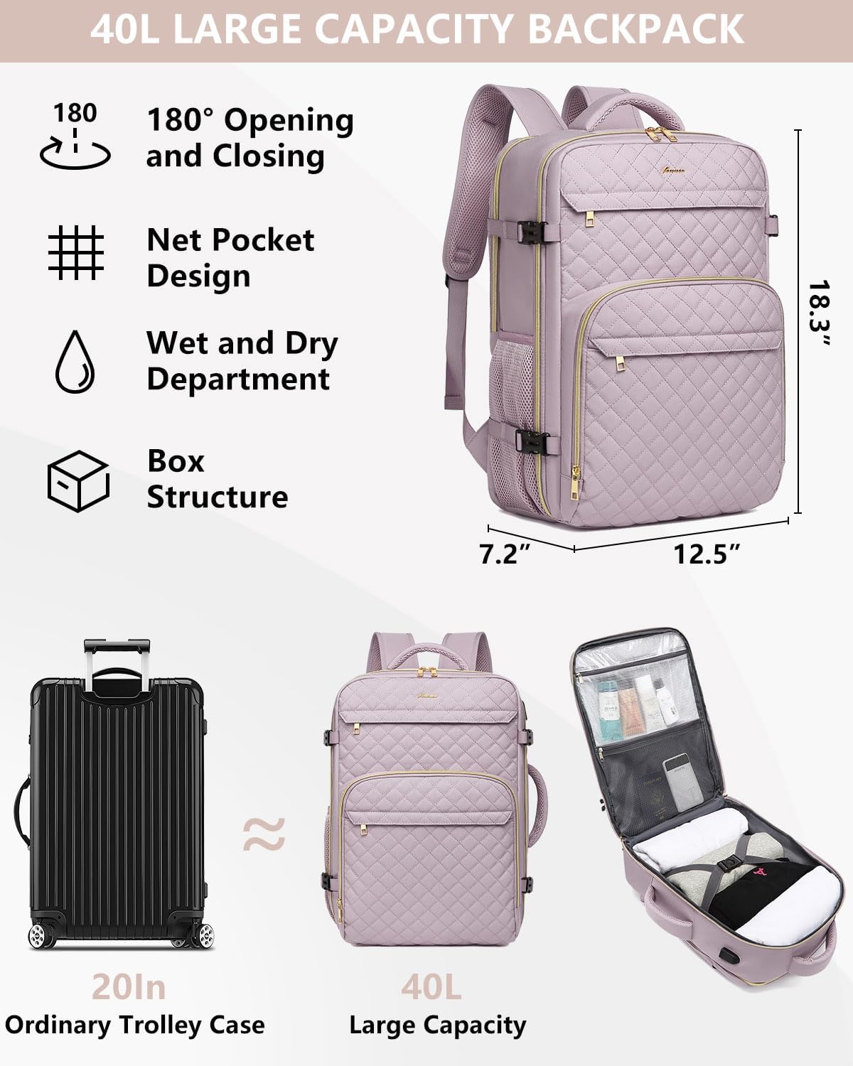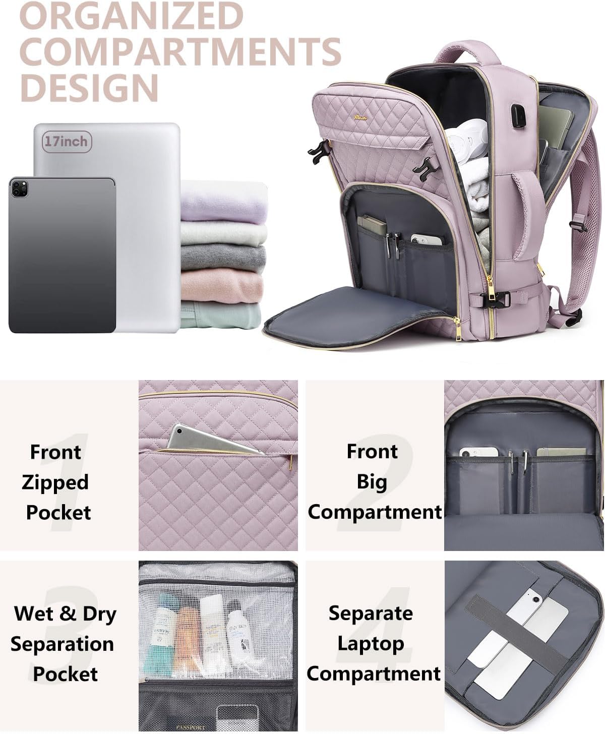 Large Capacity & Multiple Pockets: The travel backpack has a 40L large capacity and 4 main compartments, which can meet daily and travel needs. The travel backpack for women’s main compartment can store a lot of things, including 5-8 pieces of clothing, shoes, books, and many other items. The separate laptop compartment is padded with EVA foam to provide the best protection for your 17″ laptop and 12.9″ iPad. The front compartment has many pockets to keep your belongings organized