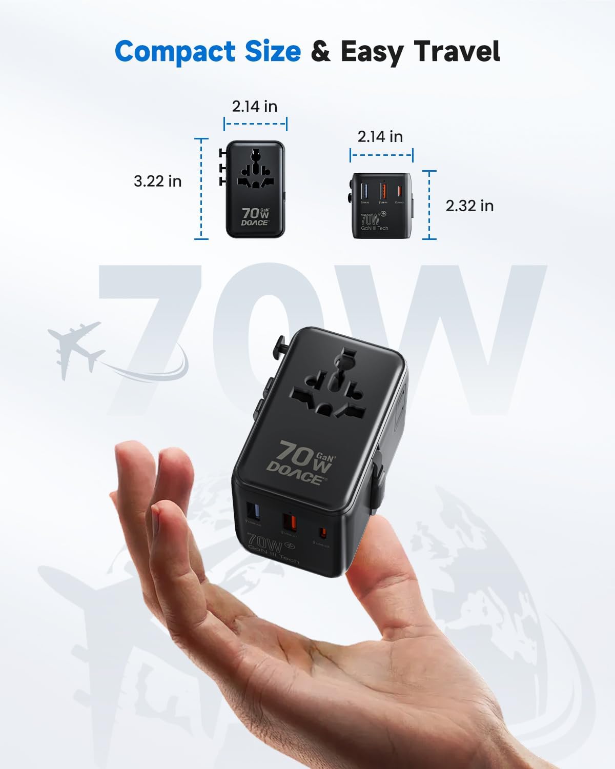 DOACE 70W Universal Travel Adapter, 6-in-1 International Plug with Built-in USB-C Cable, PD Fast Charging Worldwide Wall Charger for EU/UK/US/AU