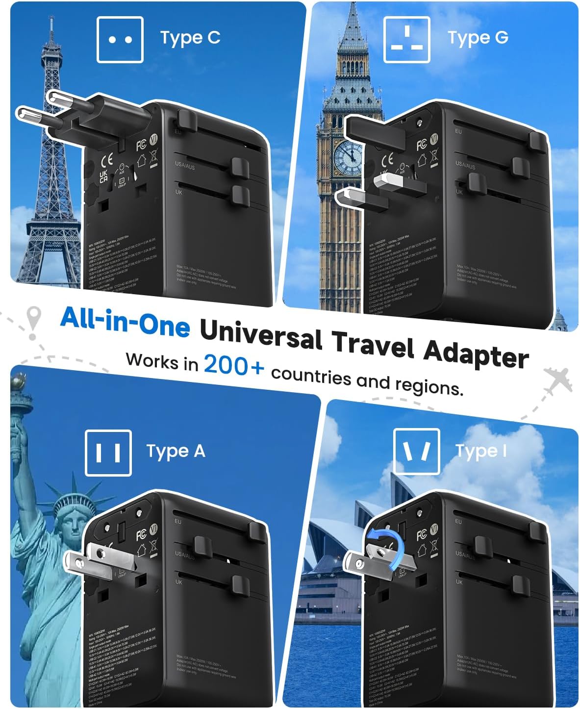 Global Travel Adapter for 200+ Countries – Includes Type C (EU), Type G (UK), Type I (AU), and Type A (US) plugs. Perfect for Europe (Germany, France, Italy), UK (England, Scotland), Asia (China, Japan, Singapore), Australia/New Zealand, and Americas (USA, Canada). Ideal for international business, study abroad, and global travelers.