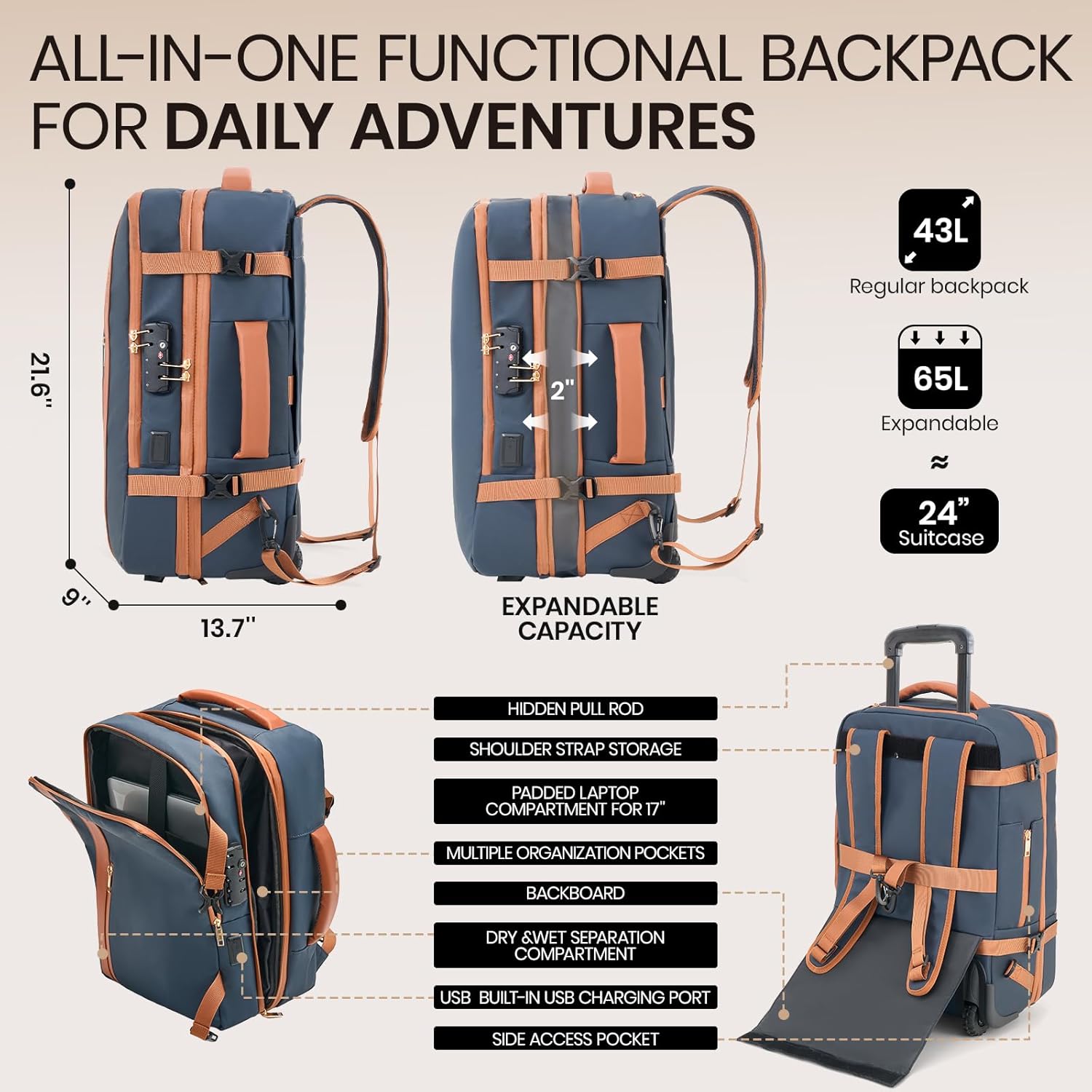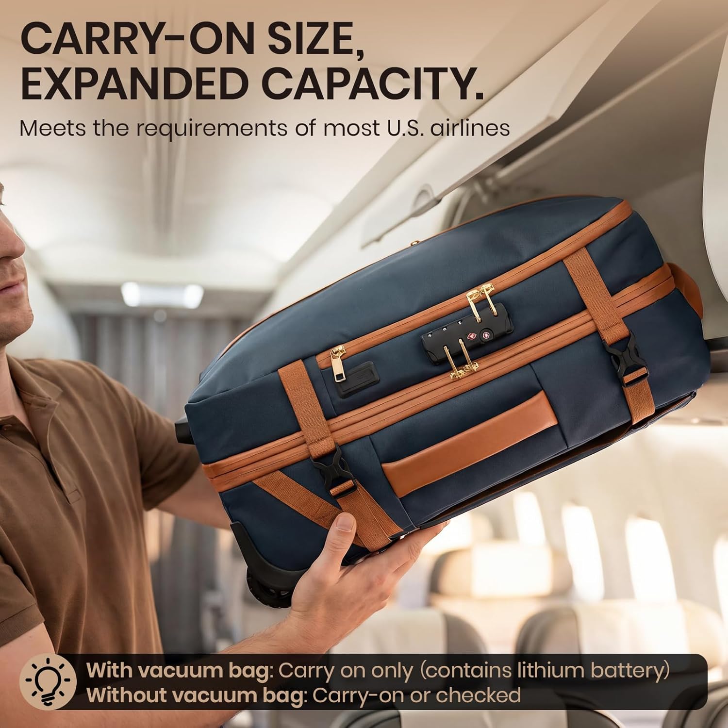 Fanwoli Rolling Vacuum Backpack Travel with One-Button Compression, Expandable Carry-On Suitcase Luggage, Approved TSA Lock & Water-Proof Laptop Compartment for Outdoor/Family/Business Trips