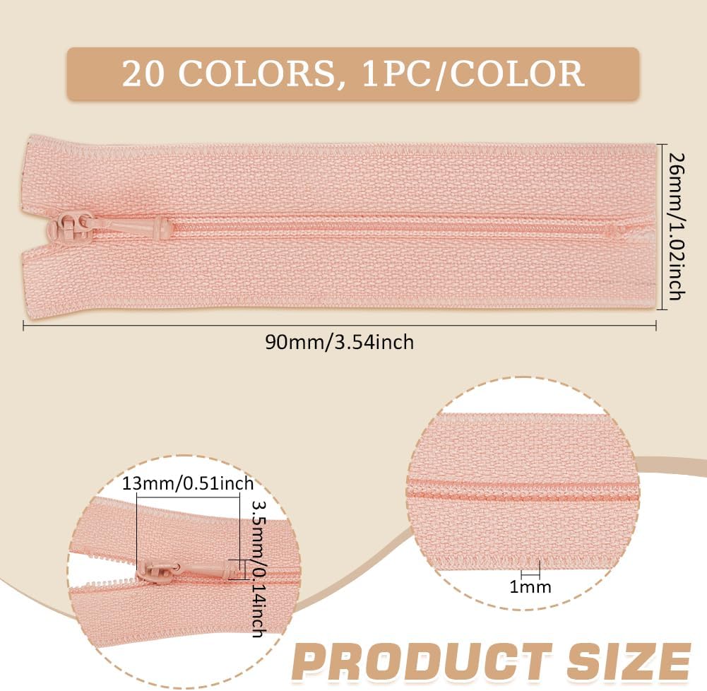 20 Colors: Each package comes with 20pcs mini nylon zippers in assorted colors to meet your different craft sewing needs, including gainsboro,whitesmoke,papayawhip,camel,coconut brown,black,blue,light sky blue,light cyan,plum,green,aquamarine,dark red,red,cerise,misty rose,pearl pink,orange,gold, pale turquoise.