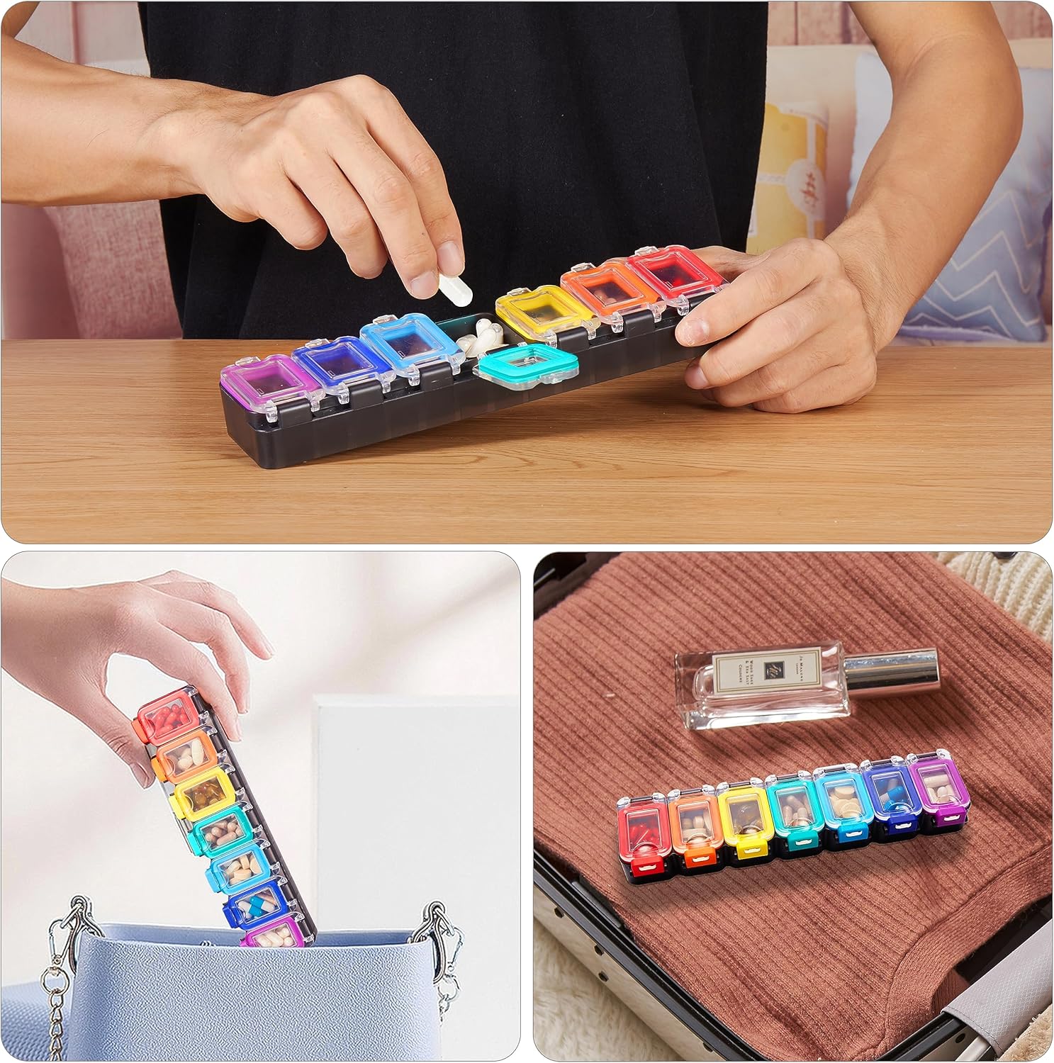 【VIBRANT ORGANIZATION】Introducing our meticulously designed weekly pill storage box, a sophisticated pill sorter that brings a spectrum of color to your regimen. With rainbow-hued seals that serve as visual cues, consider your doses remembered without the need for additional alarms. Elevate your medication management with a touch of color-coded efficiency and bid farewell to missed doses