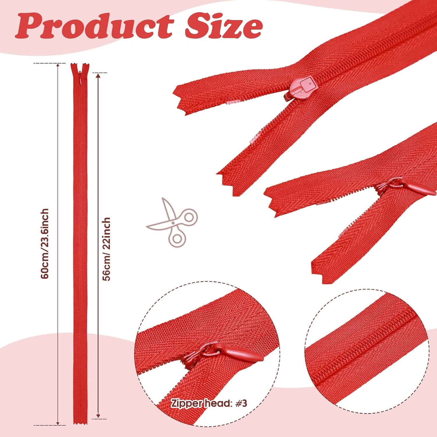 Each nylon invisible zipper measures about 23.6 inches/ 60 cm in total length, and the length of zipper teeth from bottom to top is about 22 inches/ 56 cm, you can cut the zipper into different lengths to fit the size of your items.