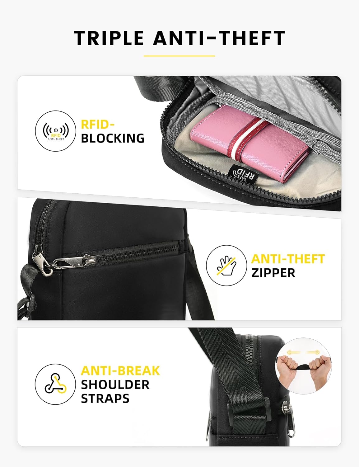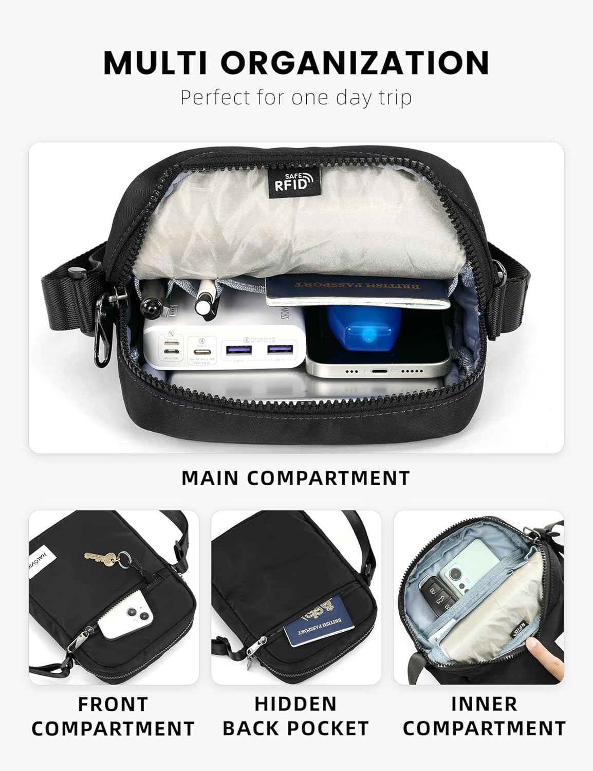 ✔ 3 secure zippered compartments + hidden anti-theft pocket
