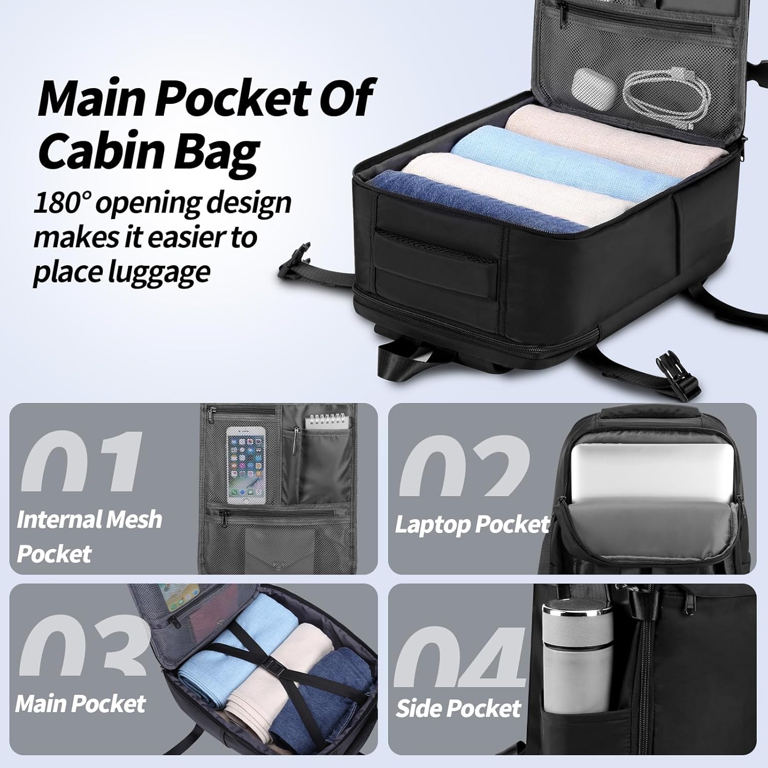 180 degree zipper closure helps pass through security check quickly. Lightweight travel backpack can be stored overhead or under seat. 15.6 inch laptop backpack meets airline carry-on requirements, suitable for Ryanair, Easy Jet, United Airlines, Spirit, Southwest, Jet Blue, Frontier Airlines