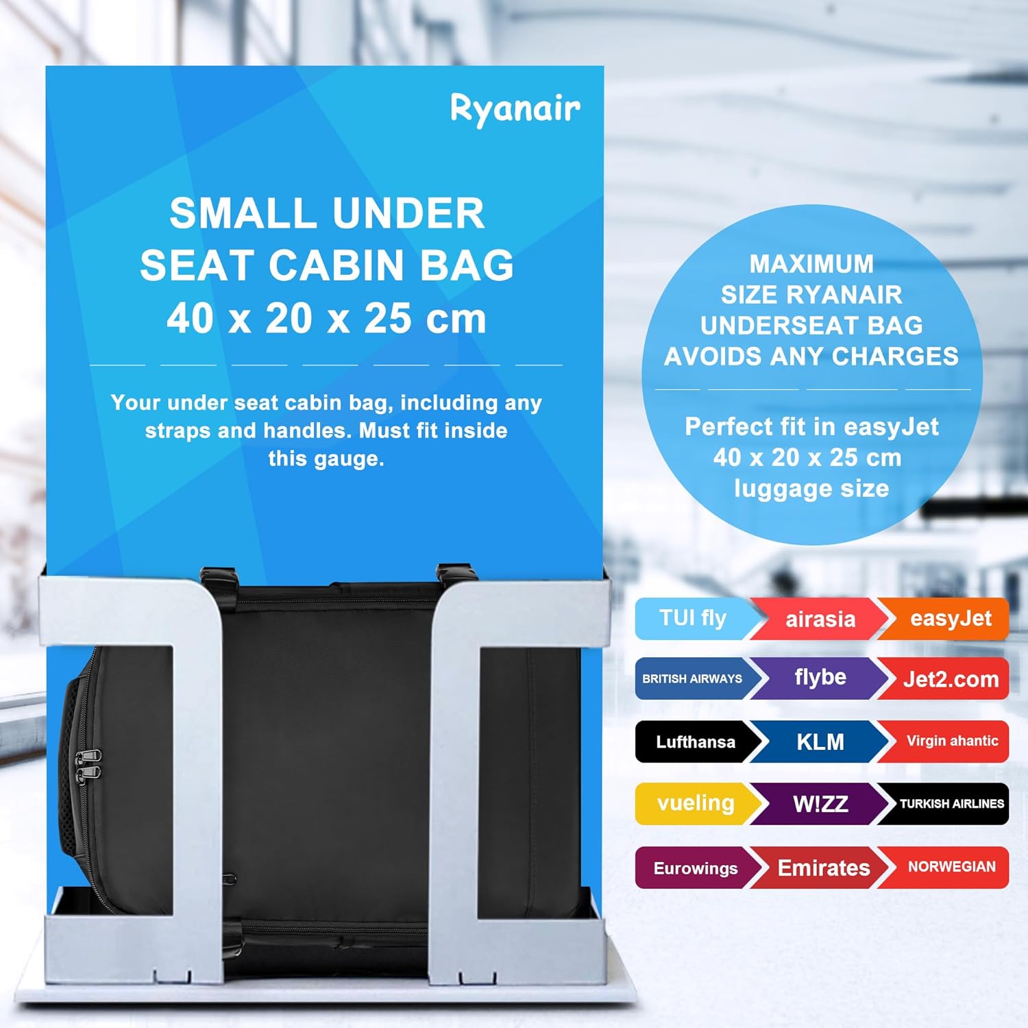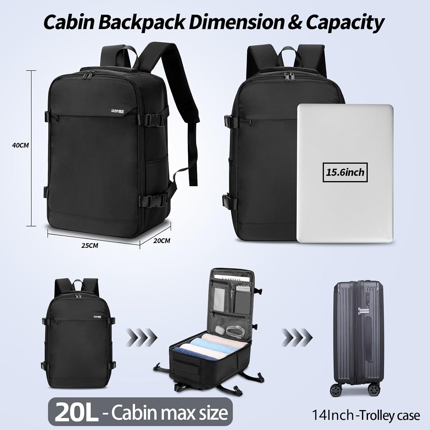 HOMIEE Ryanair Personal Item 40x20x25 Travel Bag, 20L Carry on Backpack Flight Approved Underseat Hand Luggage Cabin Bag for Weekender Gift Fits 15.6 Inch Laptop, Black