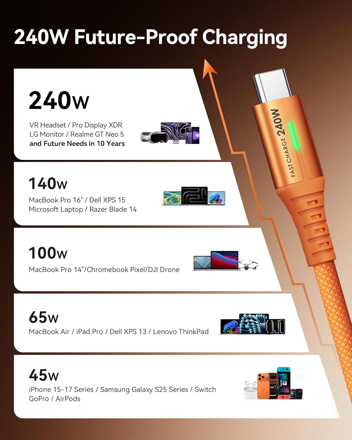 Unlike 60W or 100W cables that may limit charging speed for high-power devices, 240W supports full-speed charging for all USB-C gadgets—laptops, tablets, phones—and meets the power needs of the next 10 years.