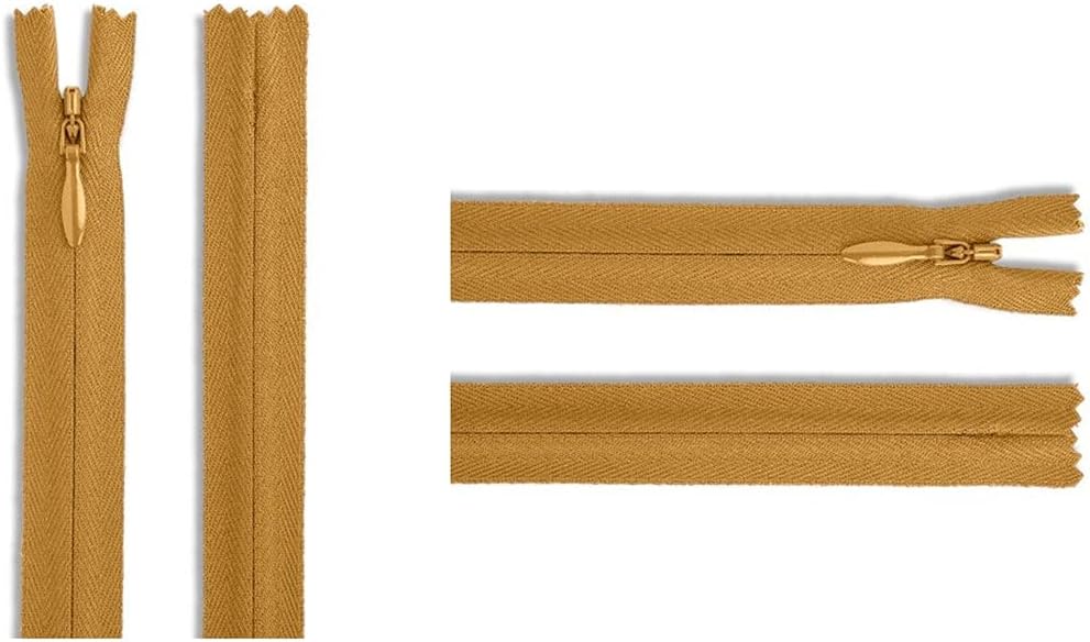 Invisible (Conceal) YKK Zippers. Perfect For Clothes, Dresses, Skirts, Crafts & Sewing Projects. Choose Your Length. Made In The United States (3 Zippers Per Pack). Color: Gold #087.