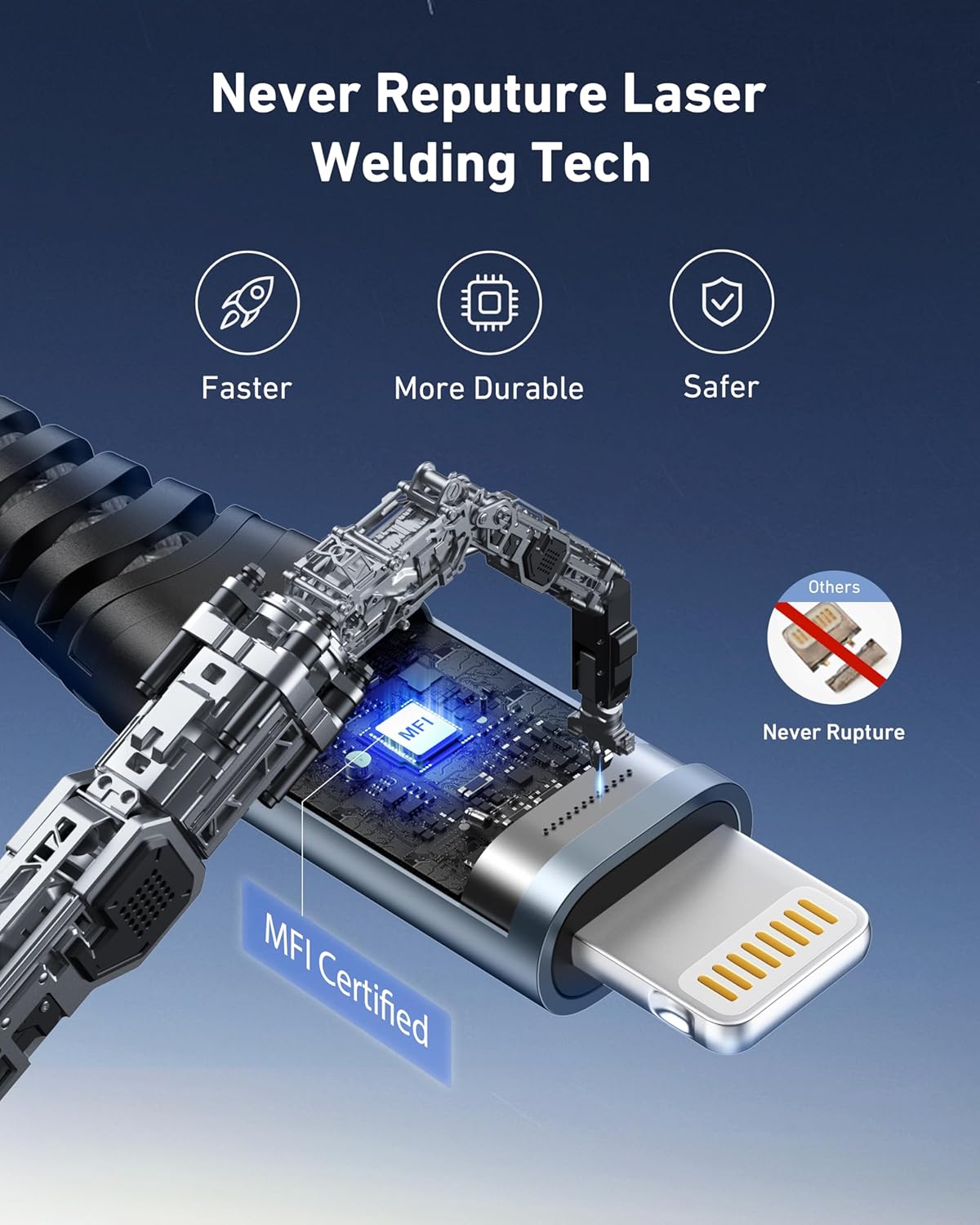 Triple Protection USB to Lightning Cable: The iPhone charger fast charging cable built-in an Apple smart chip to ensure 100% compatibility with all iPhone and iOS devices with lightning port; it built-in laser welding technology, which ensure the metal part won’t break. The copper core part is reinforced with UV glue to prevent the solder joints from falling off.