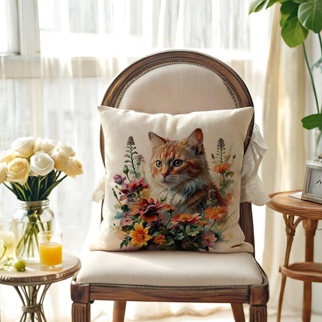 ✔Elevate your living space with this exquisite decorative pillowcases showcasing a captivating illustration of a feline companion amidst a lush floral garden.