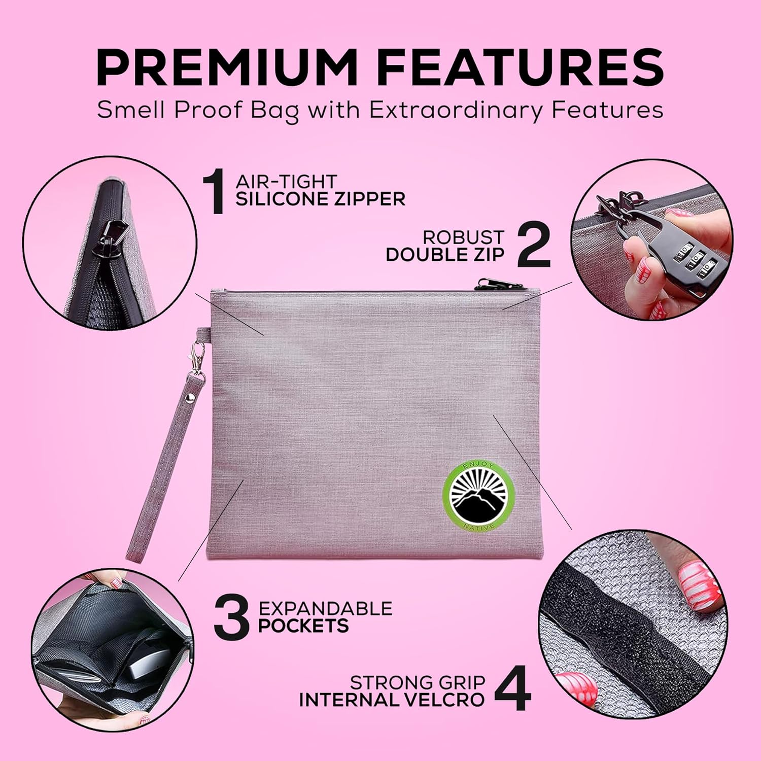 TRIPLE SECURITY: Each of our smell proof stash bags has 3 enhanced features to keep your products secure inside this scent proof bag: reinforced triple-digit steel combination lock, silicon waterproof sealed zipper, internal extra-grip fastener.