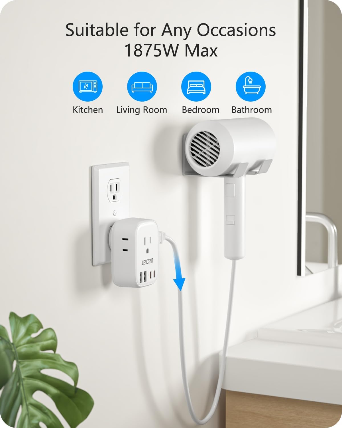 8 in 1 Multi Plug Outlet: LENCENT electrical outlet adapter box could turn 1 socket into 4 AC outlets and 4 USB (2 USB-C) ports, accepting the standard N American 2 or 3 prong flat pin plug. Max capacity up to 1875 Watt (max 125 Volt, 15 A). 4 side design can charge 8 devices simultaneously without blocking.