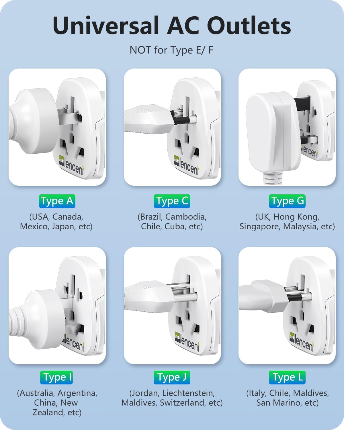 International Plug Adapter for American-This handy World to US adapter plug is designed to connect foreign devices in America, accepting plugs from Europe (Type C), UK (G), Australia/China (I), Italy (L), and Switzerland (J); Not compatible with Type E/F