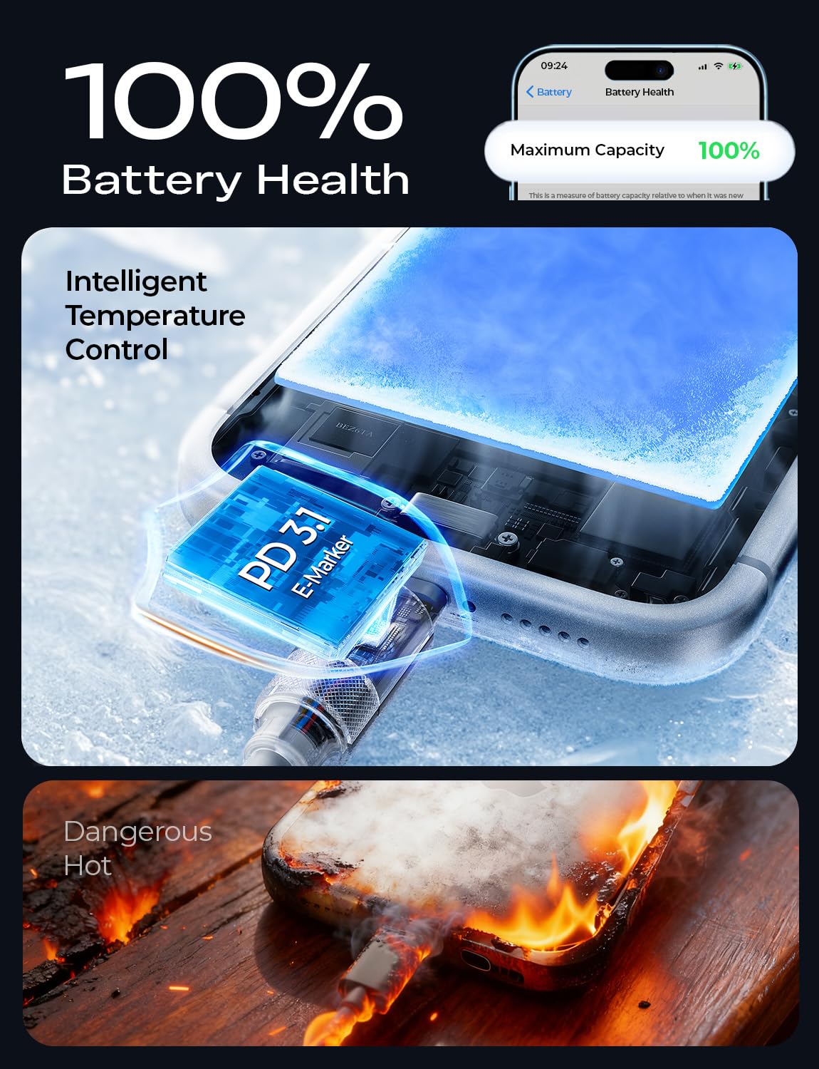 [Dual-Chip Design: SPEED SAFETY STABILITY] Market-Exclusive Dual E-Marker 3.1 chips enable 240W fast charging with 24/7 protection against over-current, voltage, and temperature. Intelligent temperature control ensures safe operation, while auto power cut-off at 100% charge safeguards battery health. The dual-chip design stabilizes power delivery to eliminate frustrating charging interruptions—no more unexpected disconnections!