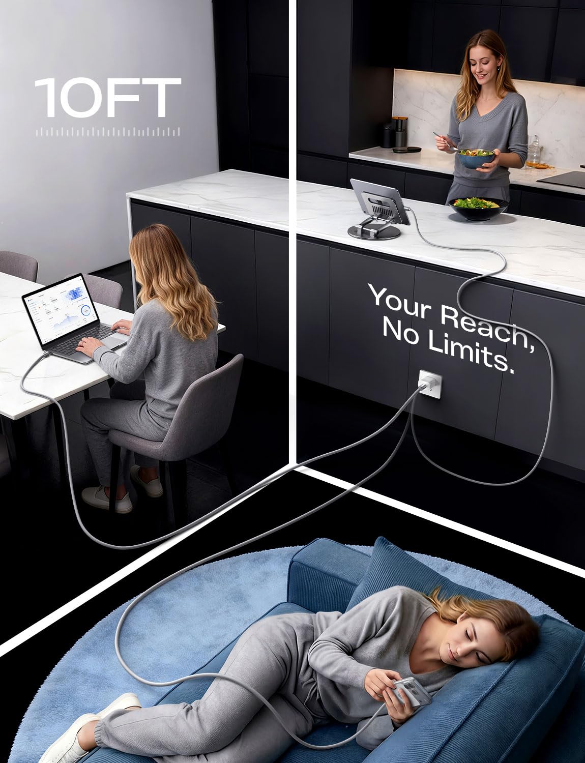 [10FT/3M: All for Freedom] The 10 ft usb c cable redefines charging flexibility with its ideal length for every lifestyle scenario. Swap out your restrictive short cable to dominate gaming marathons in the living room—no more crouching near wall outlets! Lounge comfortably on the couch even when the outlet is across the room, or roll freely in bed while binge-watching shows—this cable keeps your device powered without forcing you into awkward positions.