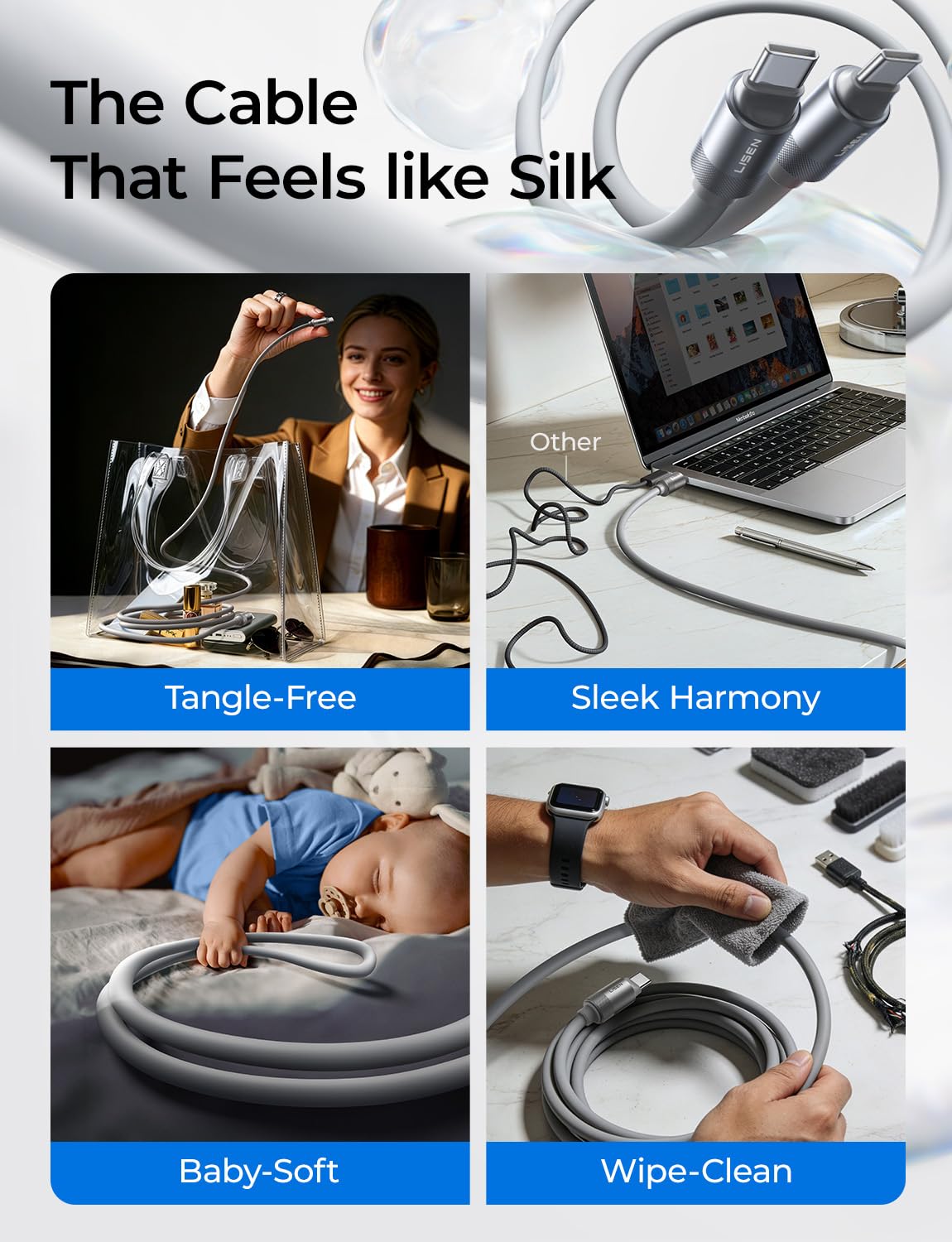 [Soft Chubby Heavy-Duty Thickened Silicone] ✓ 50,000+ Bend Lifespan: Engineered for extreme durability that outlasts ordinary 10 foot usb c cable ✓6mm Thickened insulation layer: Makes charging safer without hot, eliminating potential safety hazards. ✓ Baby-Soft & Airy Feeling: Made with food-grade silicone for a gentle, comfortable feel. ✓ Tangle-Free & Effortless Clean: Waterproof silicone resists knots and wipes clean instantly. ✓ Premium Leather Strap: Keeps your cable neatly organized and ready to go.