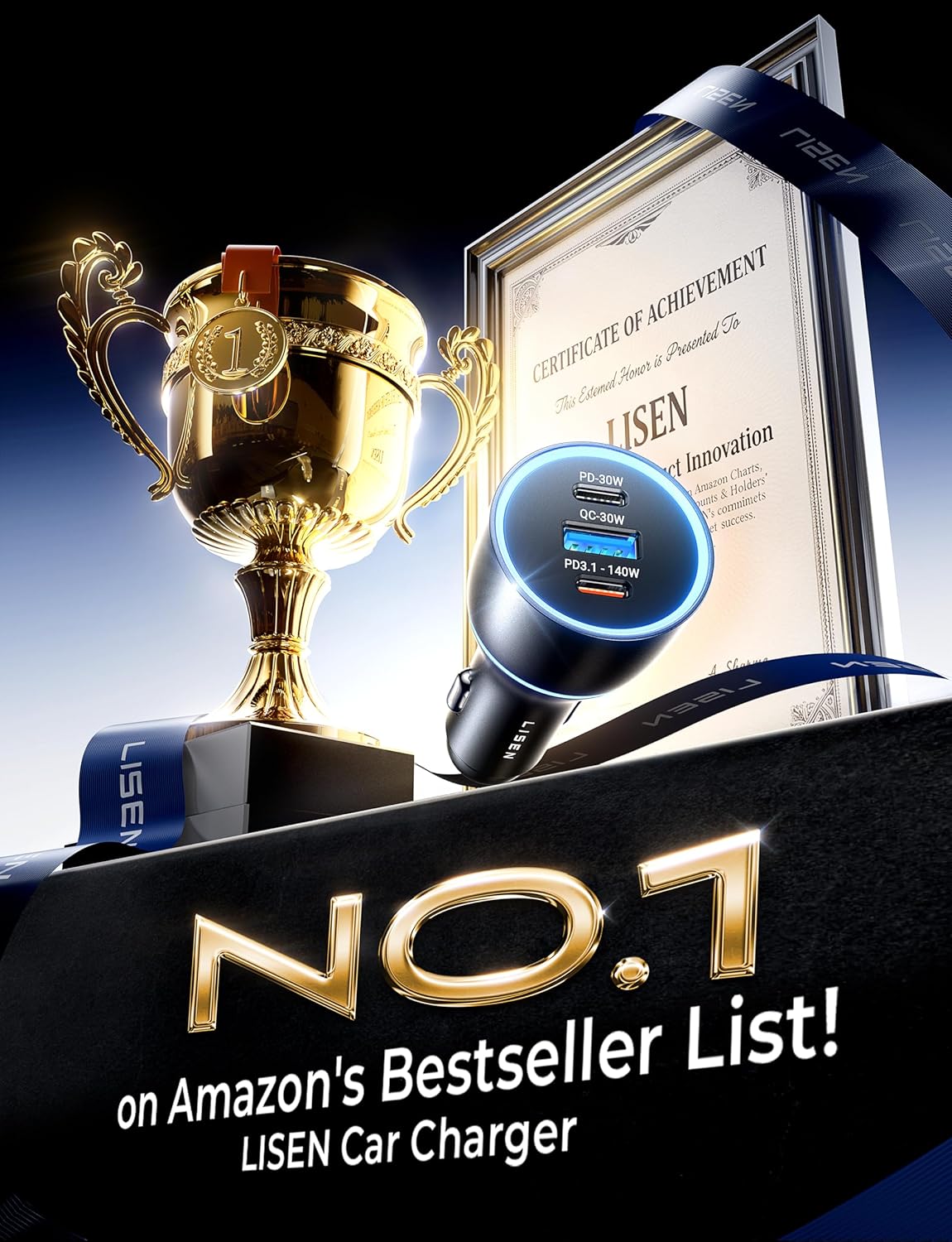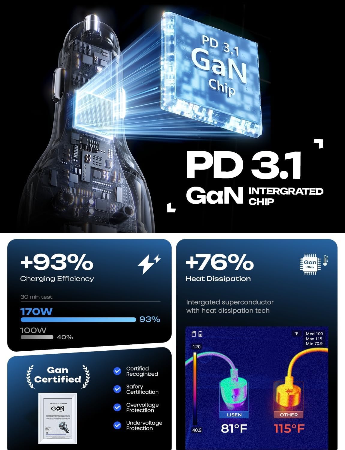 LISEN 170W Car Charger USB C Fast Charge Fast Car Charger, GaN Chip PD3.1 140W+PD30W/QC30W Cigarette Lighter USB Charger Adapter for iPhone17/16, MacBook Pro/Air, Laptop, Samsung S25/S24