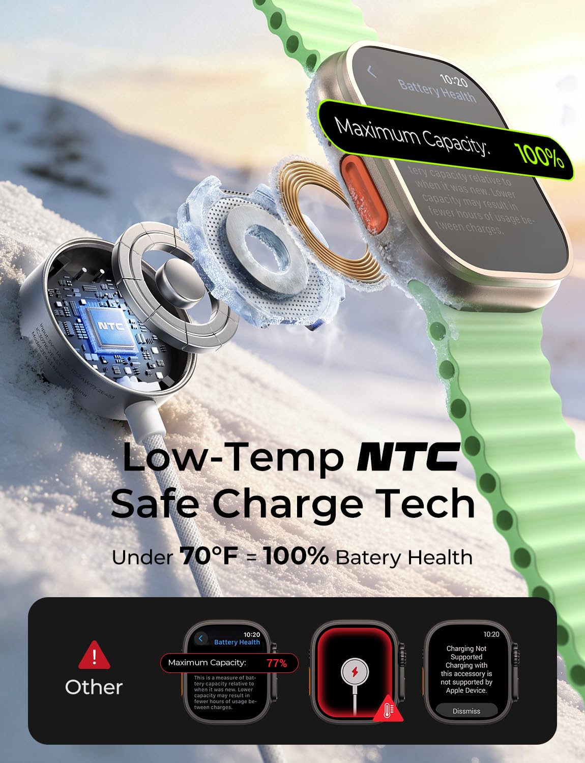 UPGRADED COOLING & BATTERY SAFETY: Overheating is the #1 enemy of battery life for any apple watch fast charger. Our charger uses an integrated metal heat-dissipation shell to prevent the “power drop” common in plastic chargers. It monitors temperature in real-time, keeping your watch cool and protecting battery health for the long term. Prevents heat-induced power drops with NTC chips and aluminum housing.