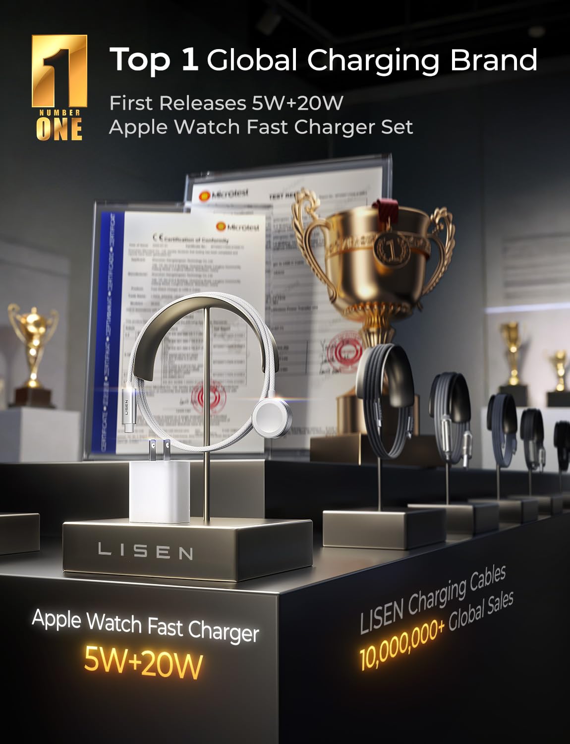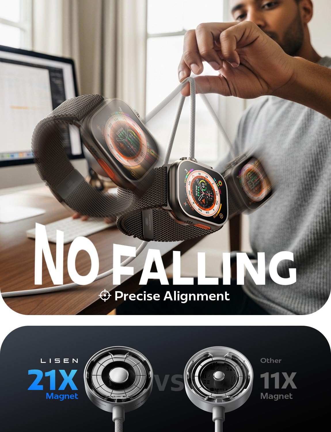 TRUE 5W APPLE WATCH CHARGER FAST CHARGING: Don’t be fooled by slow 2.5W imitators. LISEN delivers a certified 5W high-speed output, the maximum charging speed for your iwatch charger fast charging needs. Power up your Series 11/10 to 80% in just 30 minutes. Power up your Ultra 3, SE 3 and Series 7/8/9 to 80% in just 45 minutes. Power up your Ultra 1/2 to 80% in just 60 minutes. It provides the exact same efficiency as the original apple watch fast charger, ensuring you spend less time tethered to a wall. Perfect for morning emergencies, getting 50% power in 20 mins while you have breakfast.